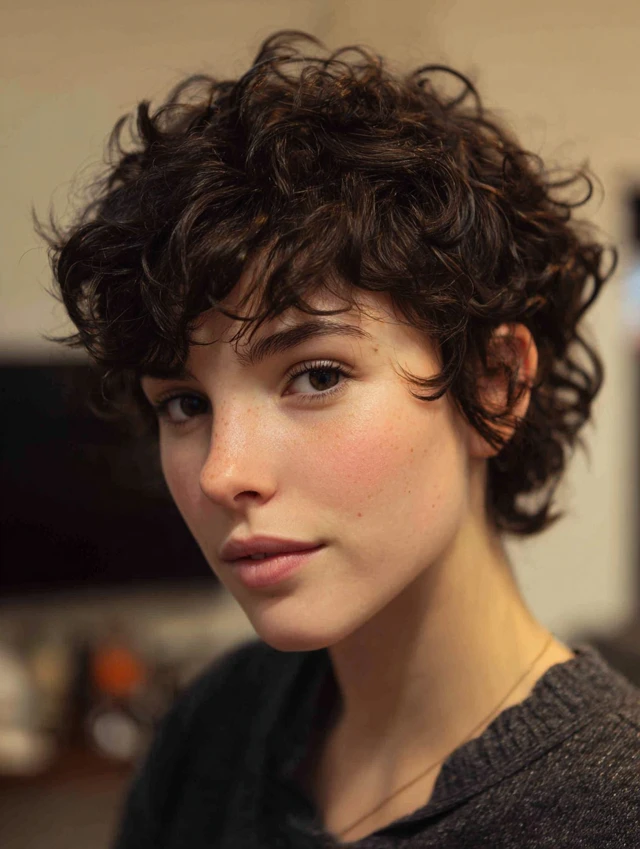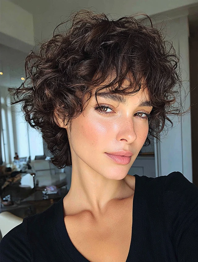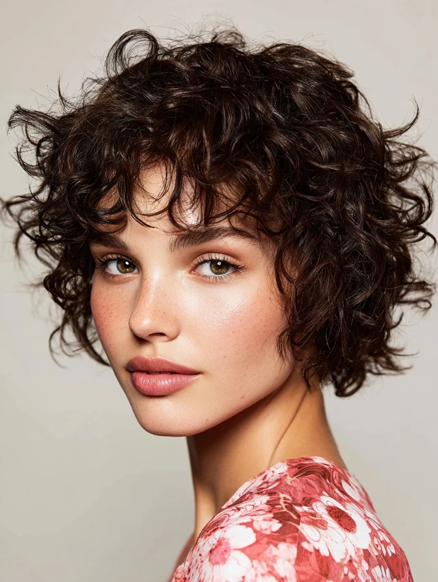 Curly short layers frame the face naturally. The cut distributes volume evenly and avoids a wide silhouette. It flatters oval and square faces by softening angles. Shoulder-grazing or shorter lengths work well.
