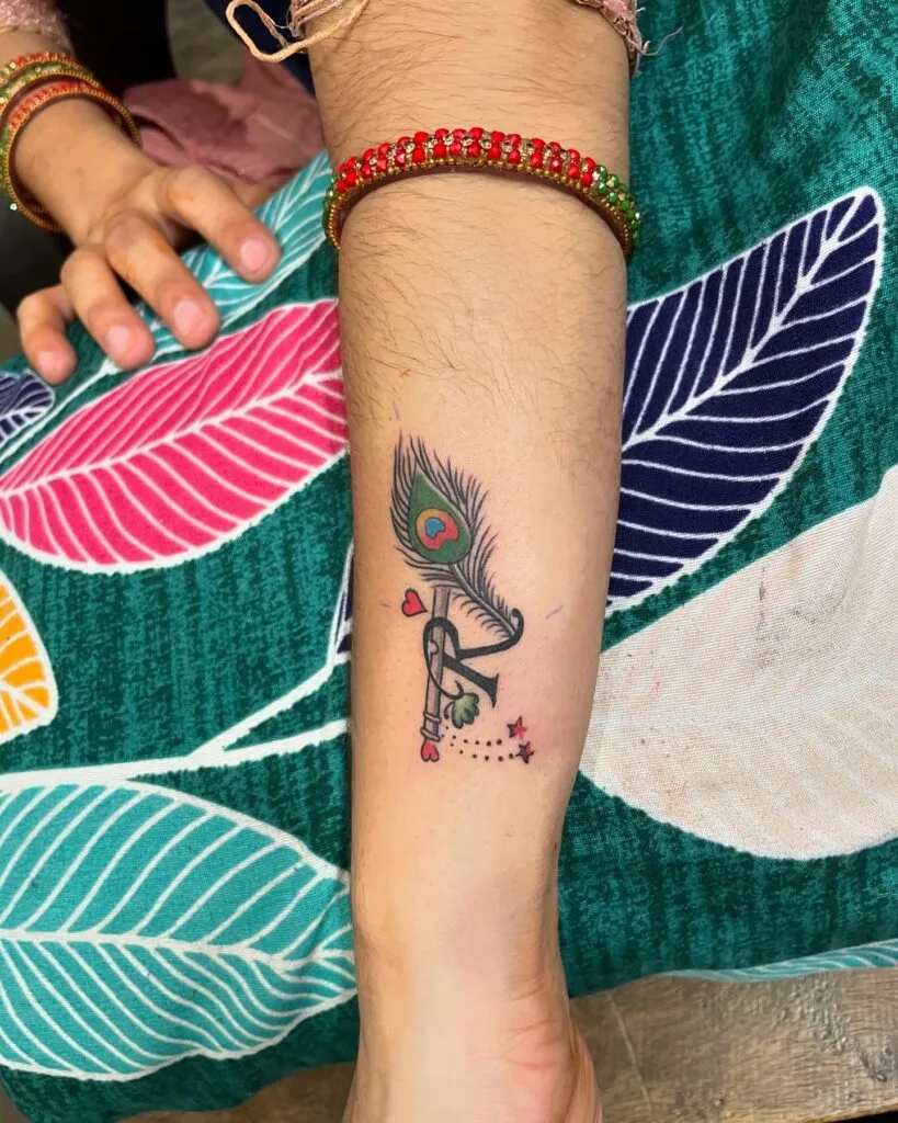 This vibrant tattoo blends culture and devotion with a creative twist. A beautifully detailed peacock feather sits above a black flute, symbolizing Lord Krishna. The feather’s vivid green, blue, and red hues contrast with the fine black lines of the flute, while tiny red hearts and stars add a whimsical, playful touch.