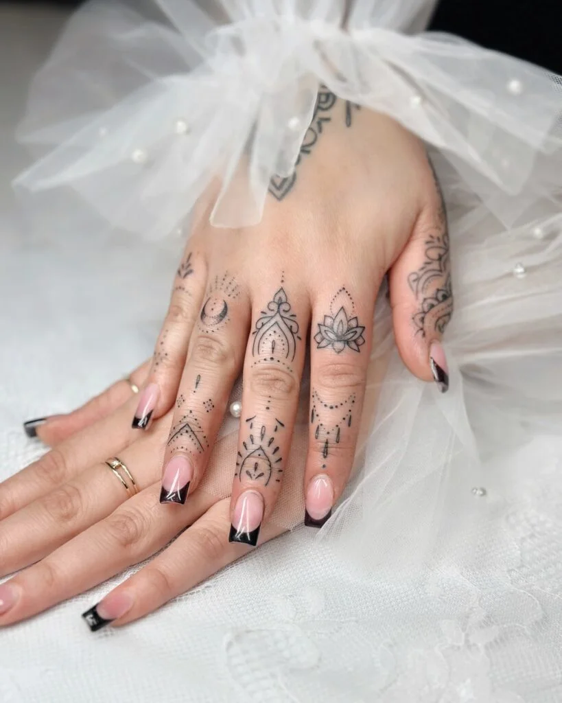 This intricate set of finger tattoos celebrates ornamental style and sacred symbolism. Each finger features symmetrical fine-line designs — tiny moons, lotus blooms, and delicate dotwork patterns — creating a captivating, unified look.