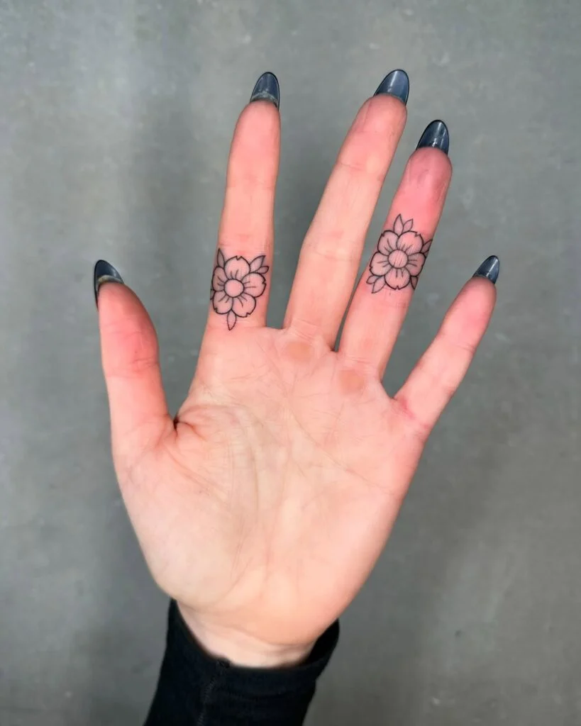 This lovely finger tattoo features two graceful flowers inked along the inner fingers. The fine black outlines and subtle detailing highlight each petal’s softness, creating a simple but eye-catching design.