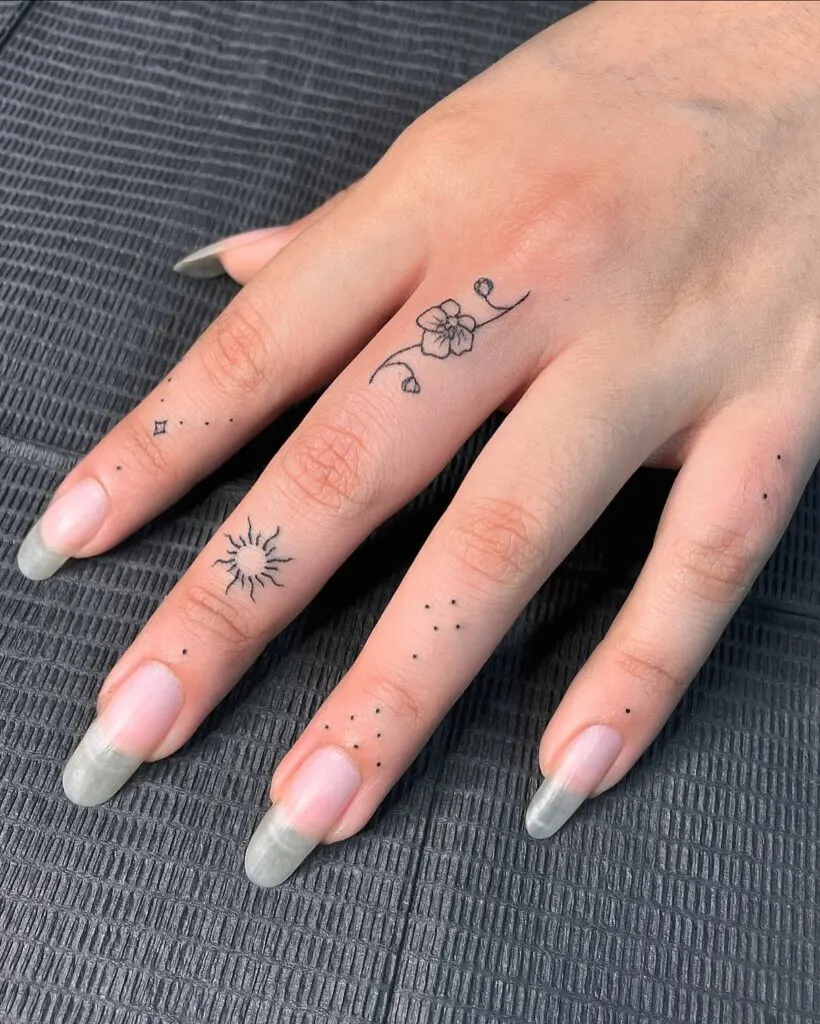 This graceful set of fine-line finger tattoos features a mix of subtle cosmic and floral elements. Delicate dots and starbursts accent each finger, creating a soft, minimalist aesthetic that shines without overpowering. A tiny vine with a single bloom adds a gentle organic touch to the middle finger, symbolizing growth and beauty.