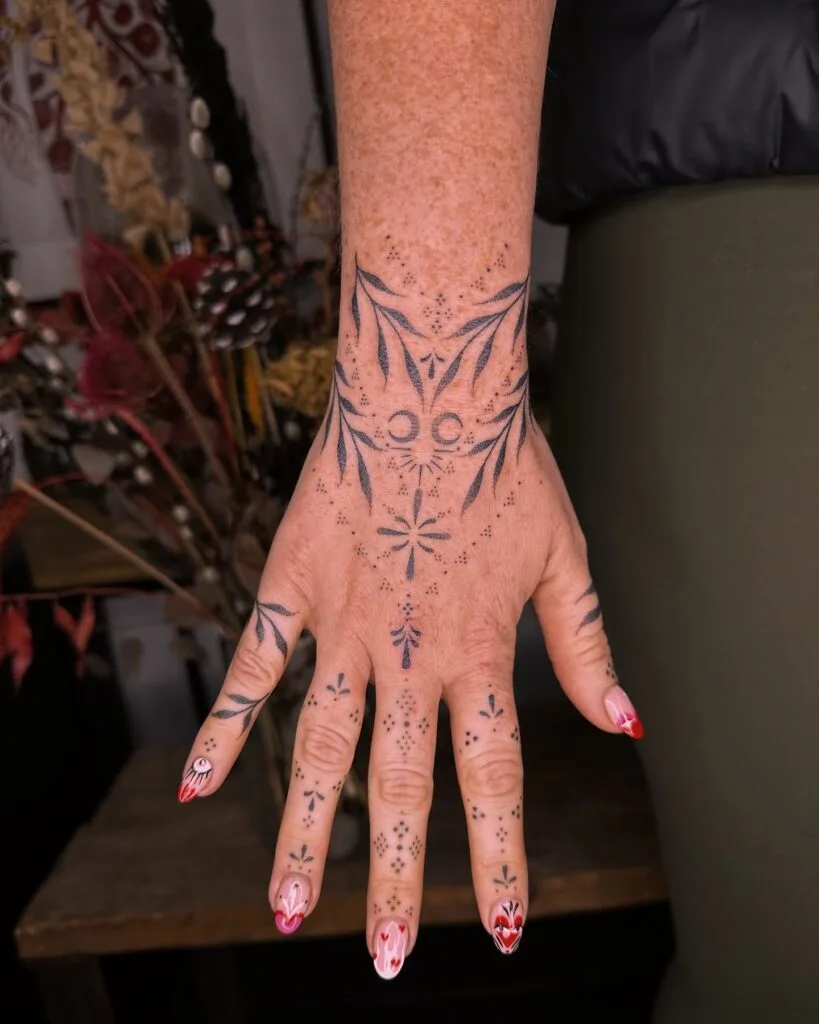 Tiny geometric elements add structure and balance, drawing attention to the fingers and knuckles. The minimalist shading and delicate lines make this tattoo feel light and decorative, like an intricate piece of jewelry. Perfect for those who appreciate timeless, organic designs with a touch of cultural artistry.