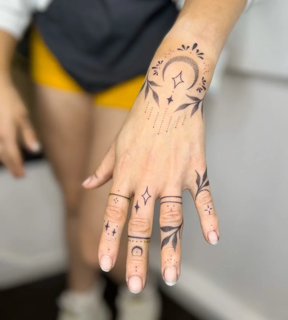 The tattoos create a feeling of harmony and movement, like wearing rings made of stardust and light. Paired with leafy hand art and subtle lettering, this style is ideal for women who love symbolic, spiritual, and fashion-forward tattoos with a minimalist cosmic vibe.