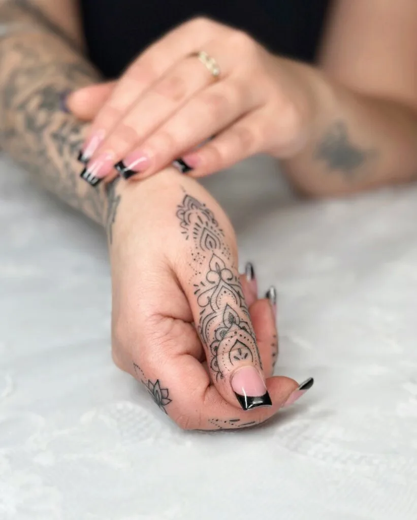 This stunning thumb tattoo features an intricate mandala-inspired design that flows from the knuckle down to the hand. The symmetrical patterns include layered petals, dot work, and ornamental accents, creating a bold yet graceful look.