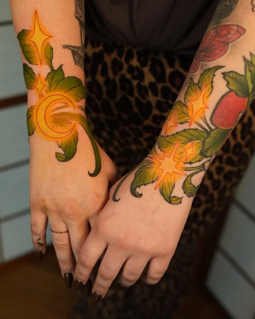 These matching tattoos feature striking green leaves with fiery yellow-orange accents, stretching across the wrists and hands. The bright bursts radiating from within the leaves resemble glowing embers or magical sparks, blending natural and mystical imagery.