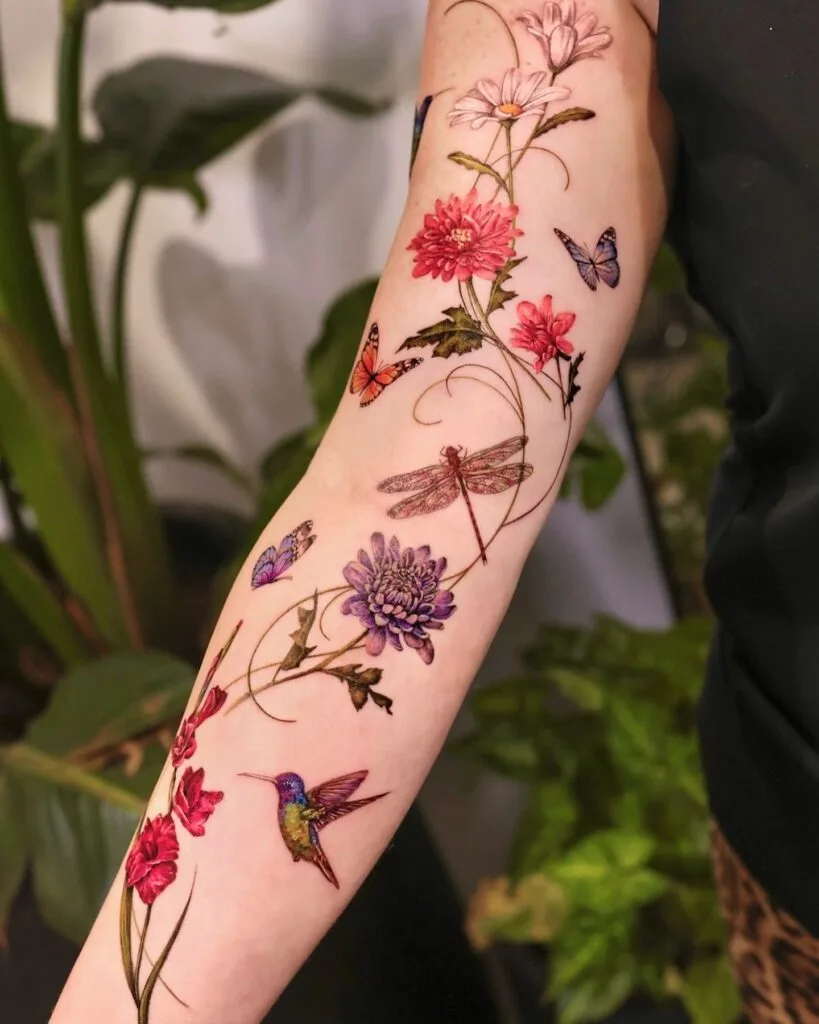 This lively forearm tattoo bursts with color and detail, featuring a vibrant mix of flowers, butterflies, a dragonfly, and a hummingbird. Each element is delicately placed along winding stems, creating a vertical garden that blooms with daisies, chrysanthemums, gladiolus, and more.