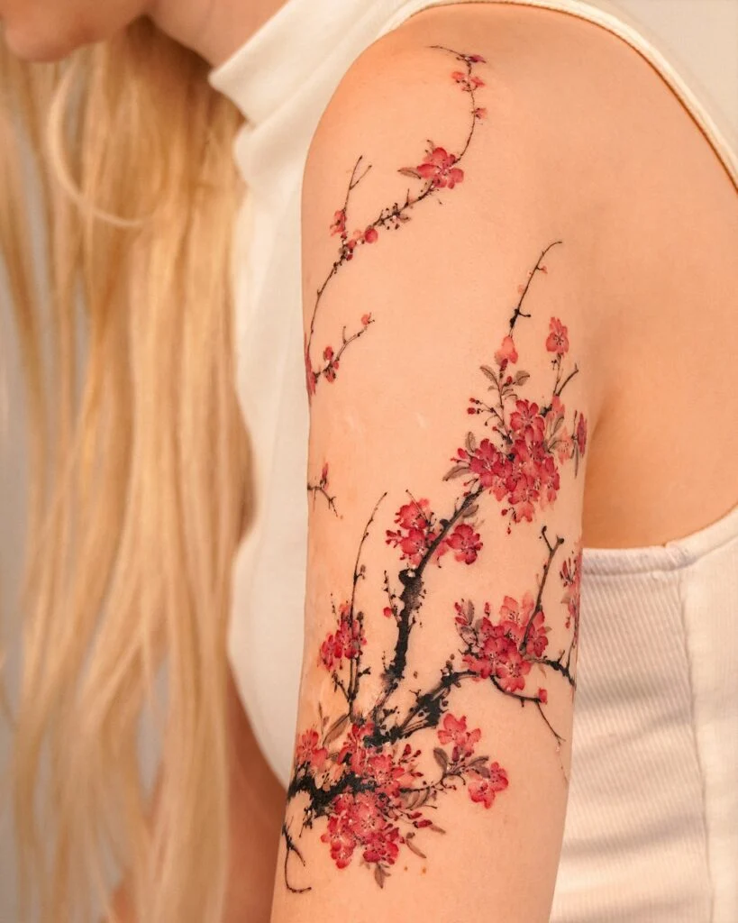 This breathtaking upper arm tattoo features a blooming cherry blossom branch rendered in rich shades of crimson and pink. The blossoms are delicately placed along dark, brushstroke-like branches that create an ink-wash effect, adding a painterly, almost traditional Japanese aesthetic.