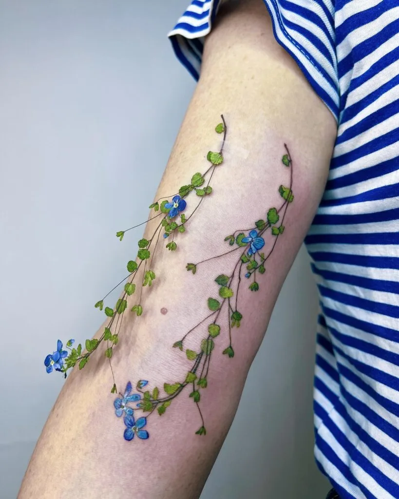This enchanting tattoo captures delicate blue wildflowers intertwined with fine green vines and tiny heart-shaped leaves. Positioned along the inner arm, the design flows naturally with the body’s shape, creating a soft, draping effect.