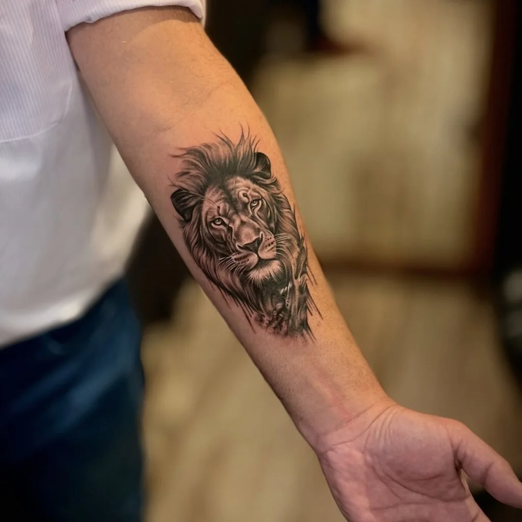This striking forearm tattoo features a highly detailed black and gray lion portrait, showcasing its intense gaze and majestic mane. Positioned vertically on the inner forearm, the lion’s face is rendered with smooth shading and realistic texture, symbolizing strength, courage, and leadership.