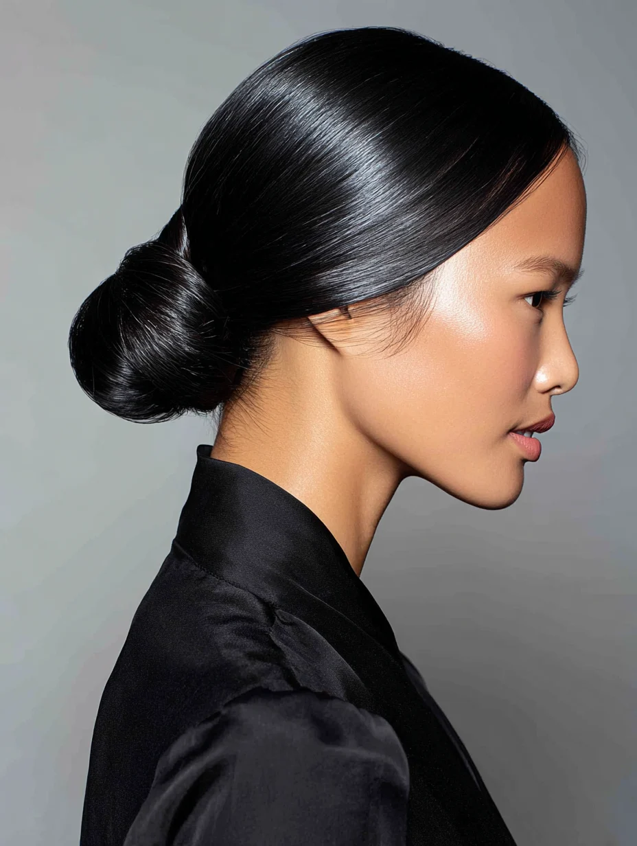 A sleek low bun gives you clean lines and a sharp silhouette. It flatters oval, heart, and square faces because it shows cheekbones and jaw shape. Fine hair benefits from a tight base and a smoothing cream to reduce wisps. Keep the bun at the nape for a classic look that suits office events and weddings.