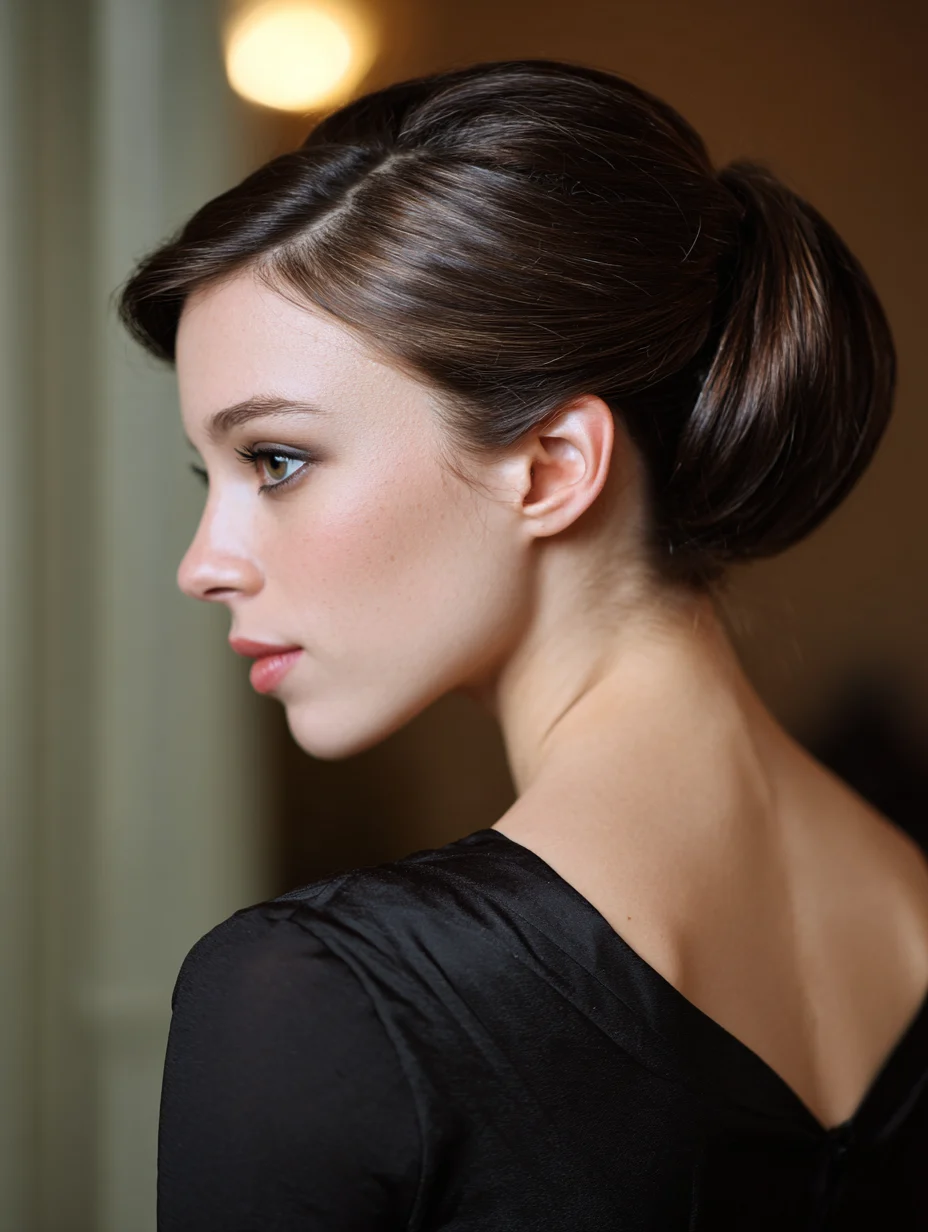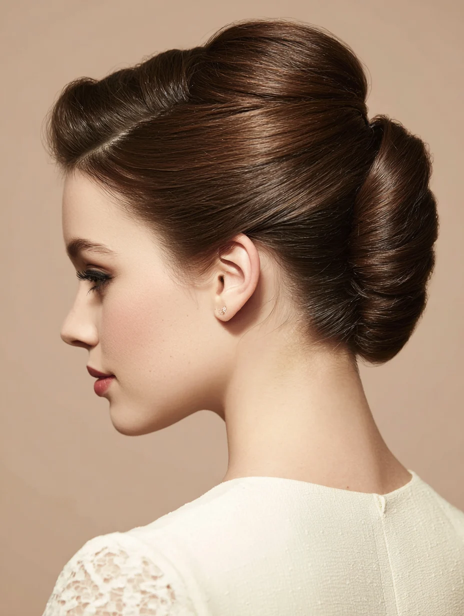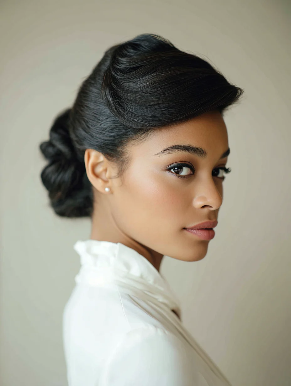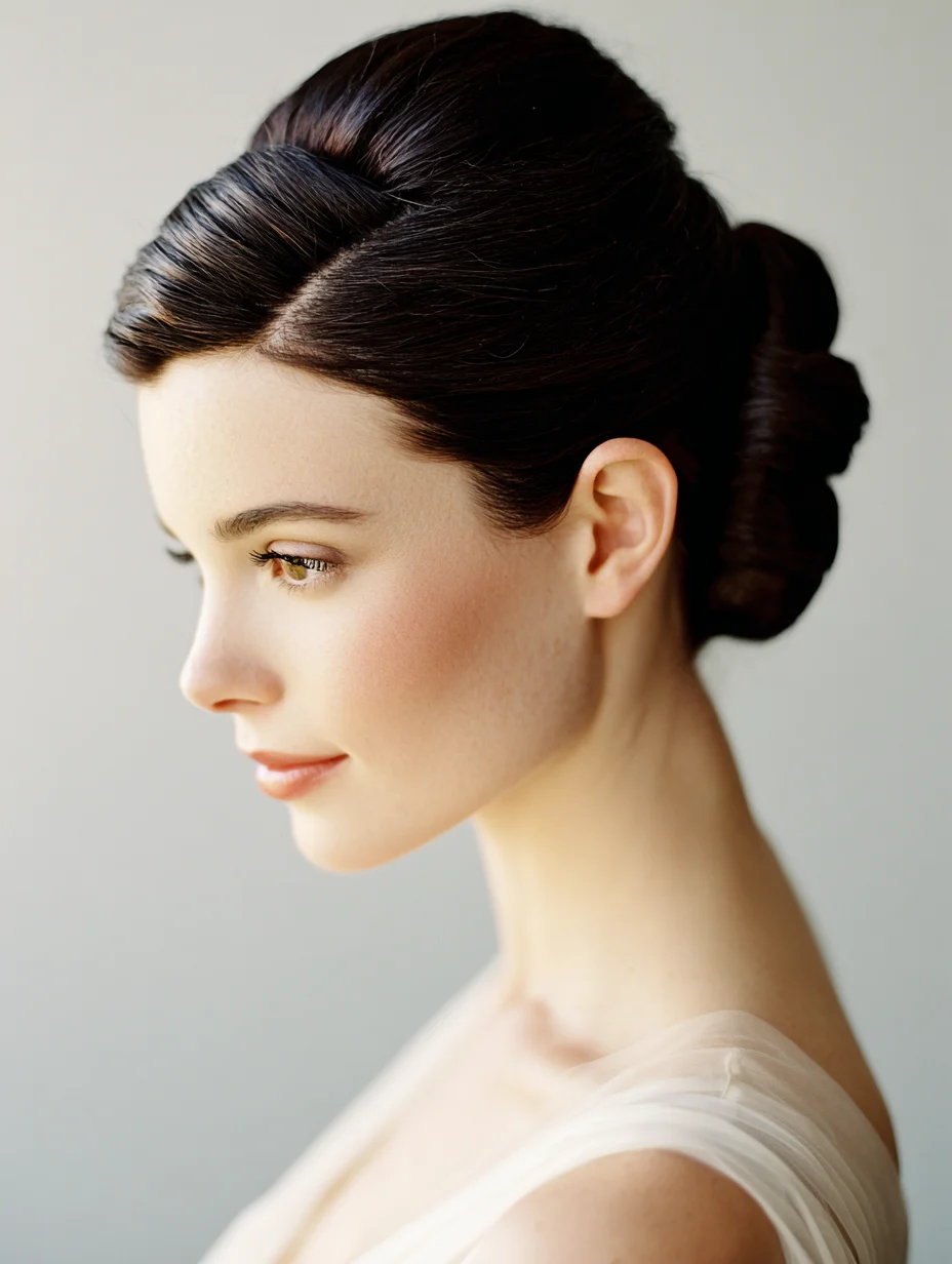 A French twist brings instant elegance and keeps your profile clean. It flatters most face shapes, especially oval and diamond, because it elongates the neck. Straight and relaxed hair creates the smoothest finish, but wavy hair can look even richer. Use a firm brush and a light gel to control the surface.