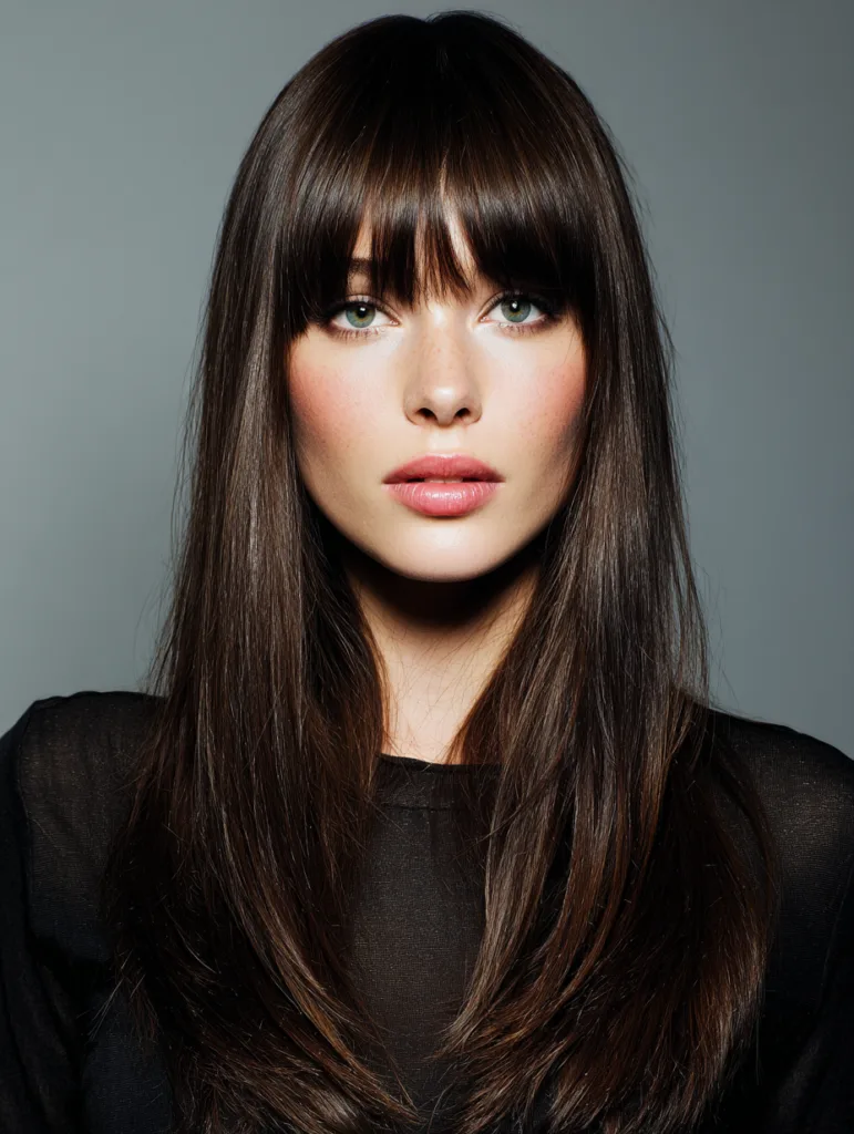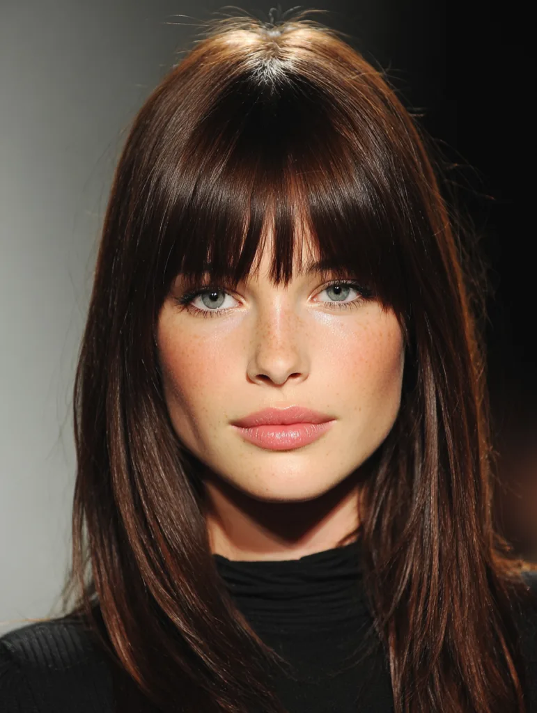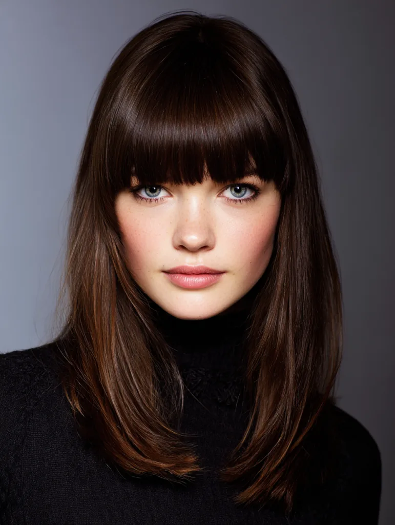 This fringe hairstyle features a straight, even line across the forehead. It suits oval and long face shapes by creating balance. Straight or slightly wavy hair shows the shape best. Maintenance requires regular trims, but daily styling stays simple. A flat brush and light blow dry keep it smooth and controlled.
