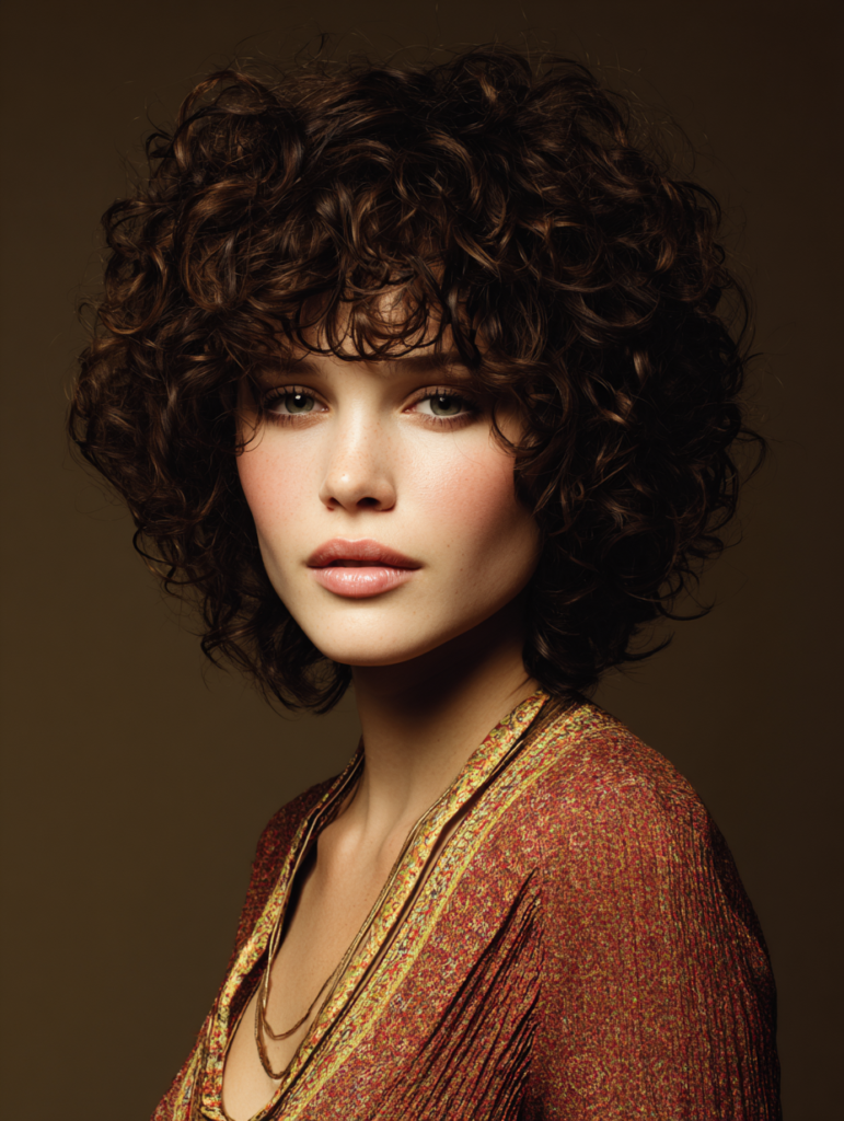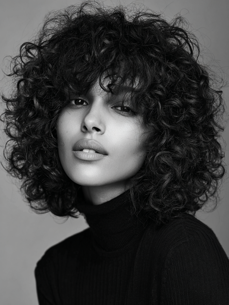 A curly fringe hairstyle follows the natural curl pattern across the forehead. It suits oval and longer faces by adding width and softness. Curly or coily hair types work best. Proper moisture and curl definition matter more than heat styling.