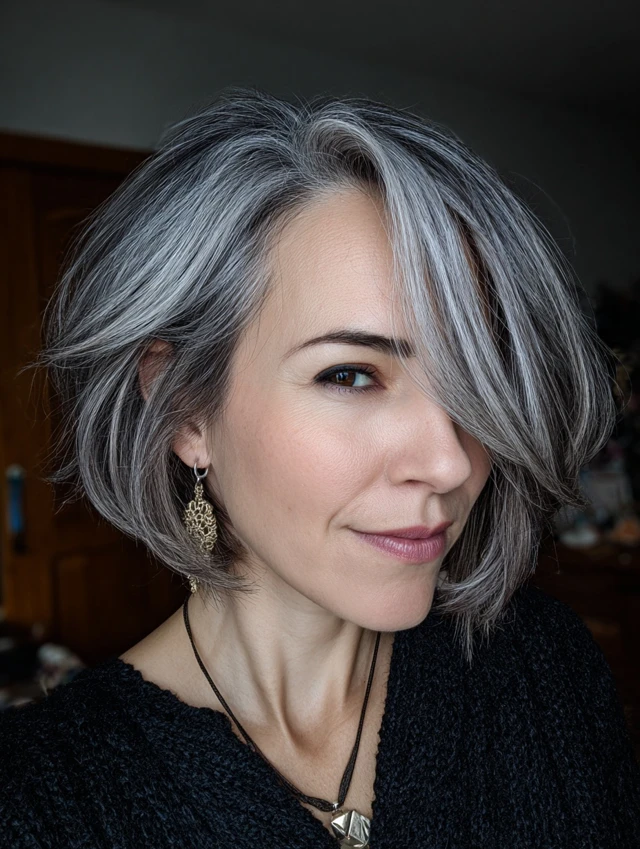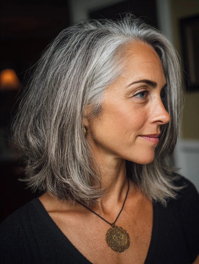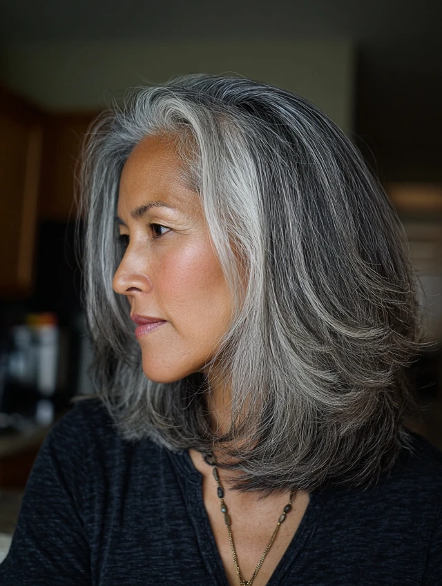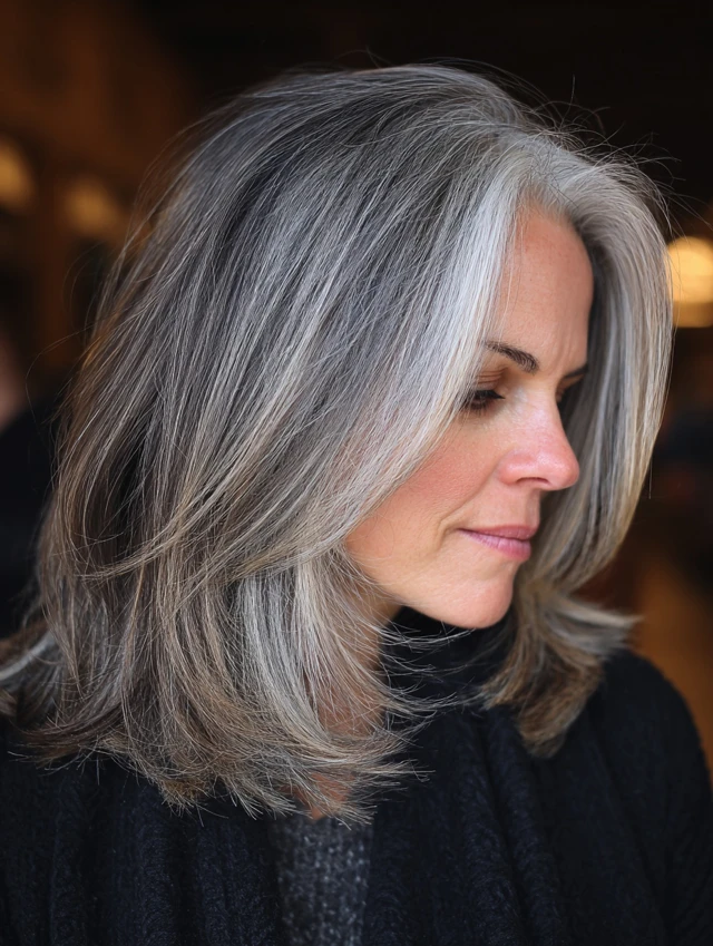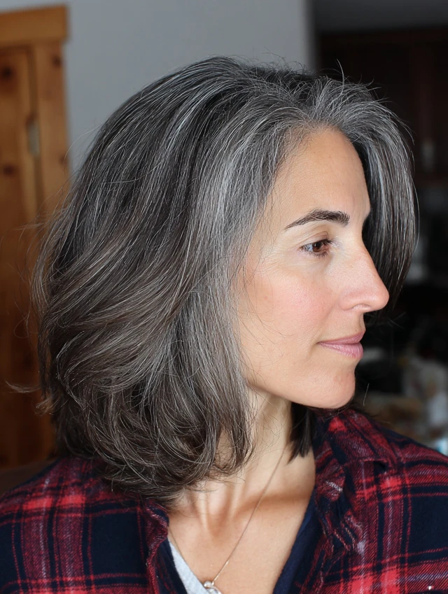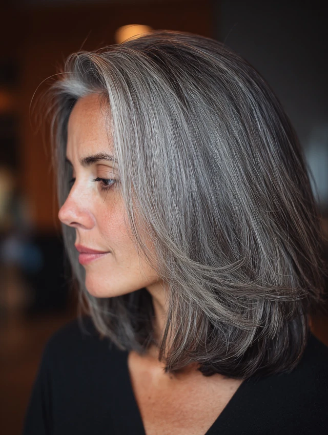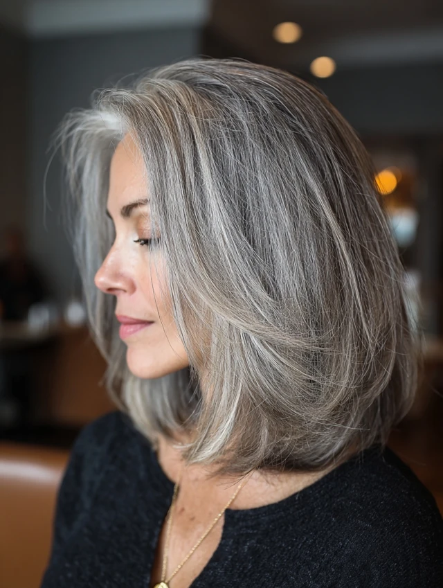 Haircuts also matter. Layered shapes add movement and break up color blocks. Gray hair transition hairstyles for women succeed when they focus on blending and texture instead of full coverage.