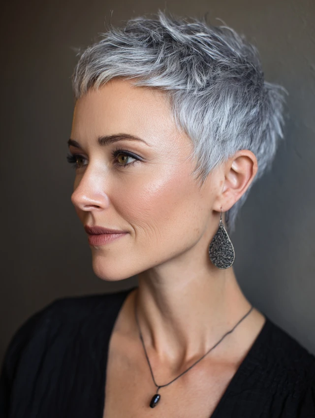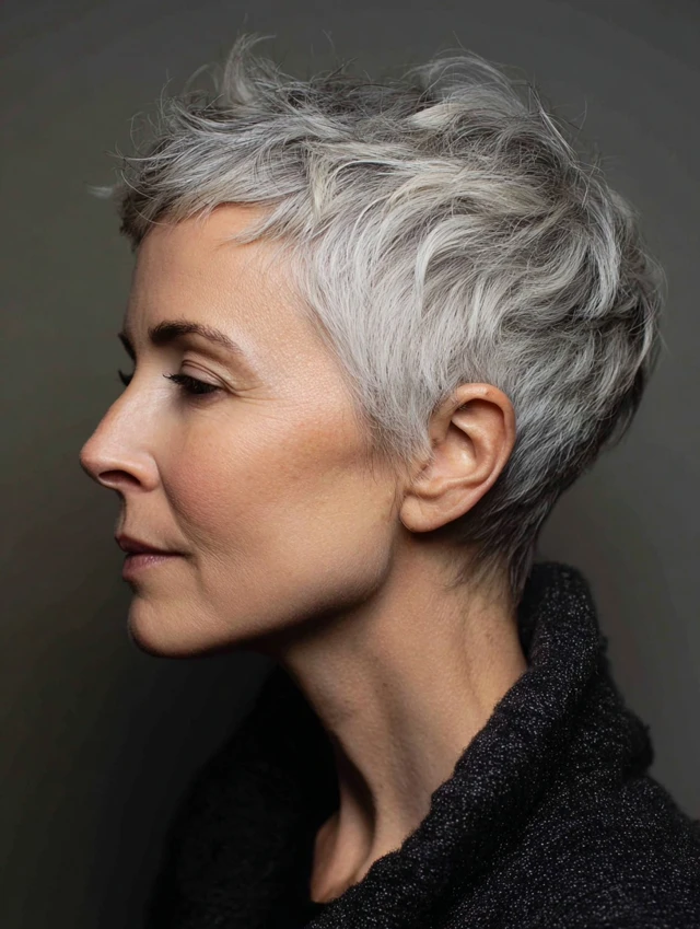 A pixie removes most of the dyed length quickly. This speeds up the transition. It flatters oval and petite face shapes while highlighting natural silver.