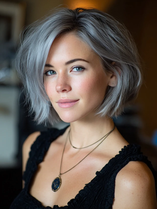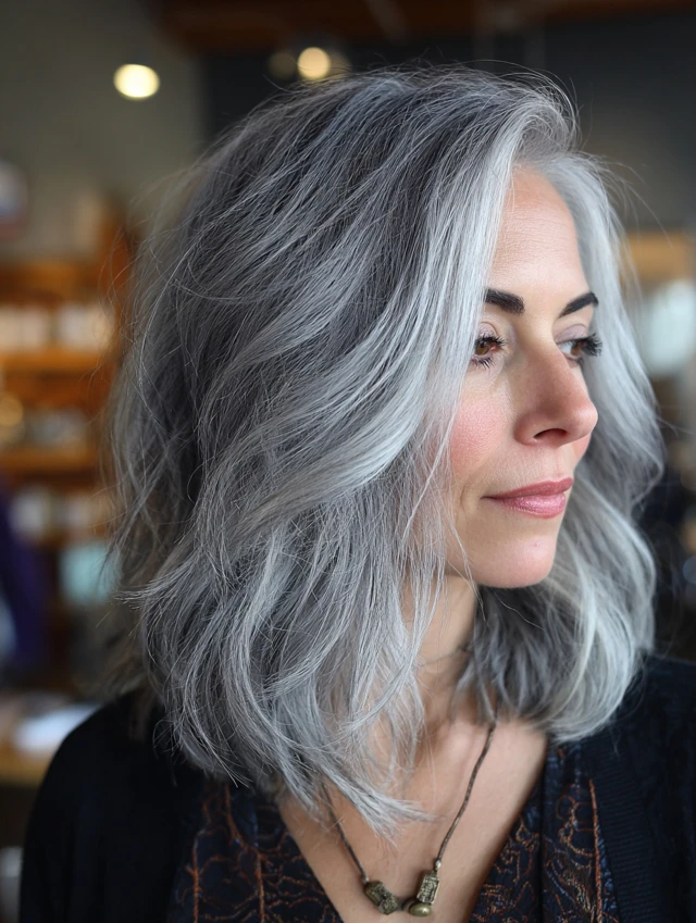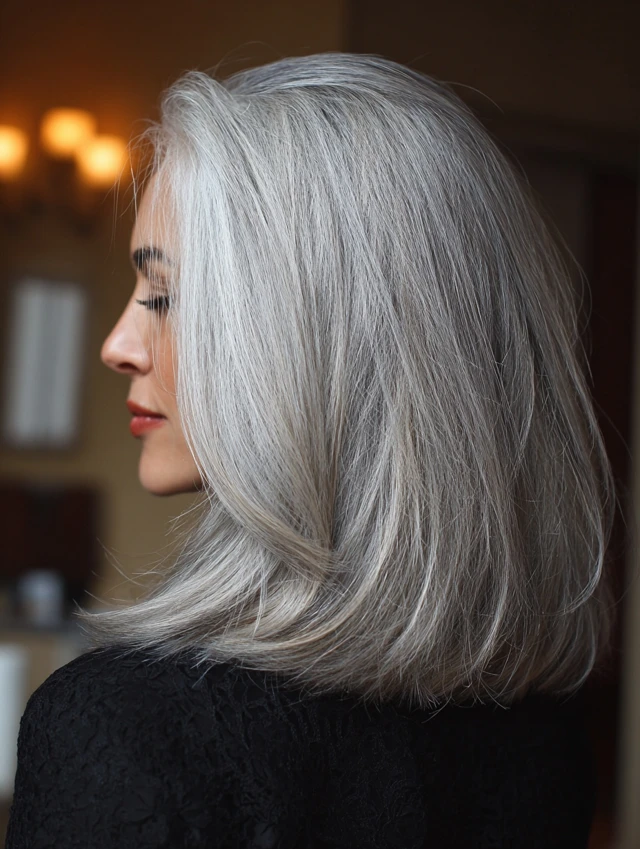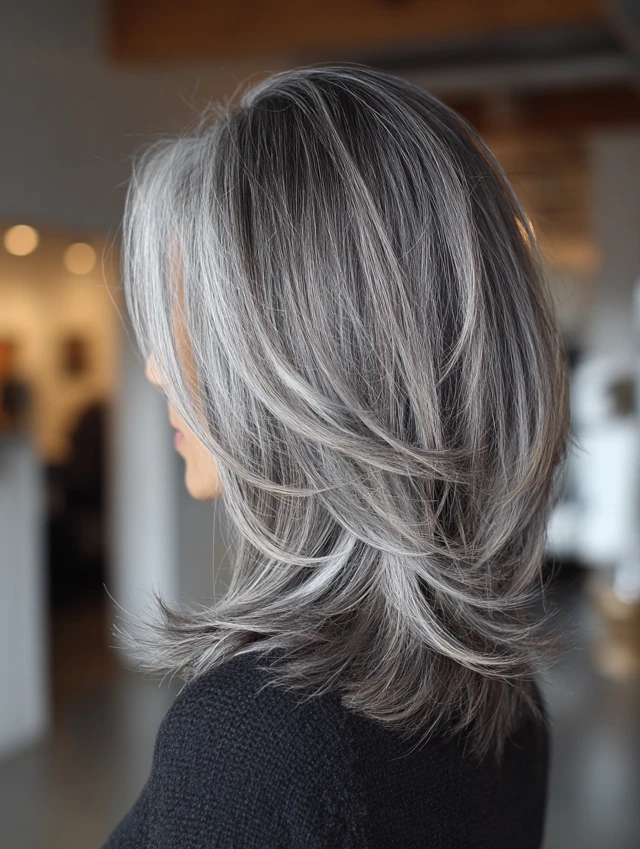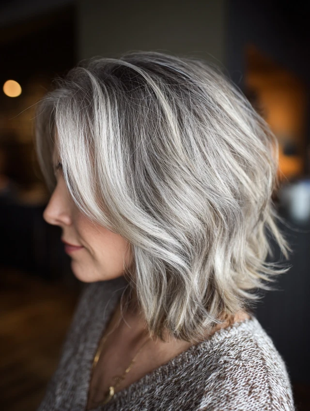 A silver balayage blends natural gray into lighter tones. This technique softens the line between dyed hair and new growth. It flatters most face shapes because placement focuses around the face.