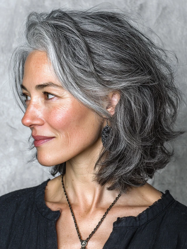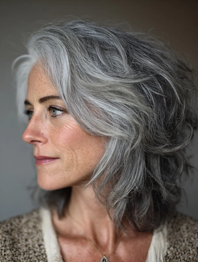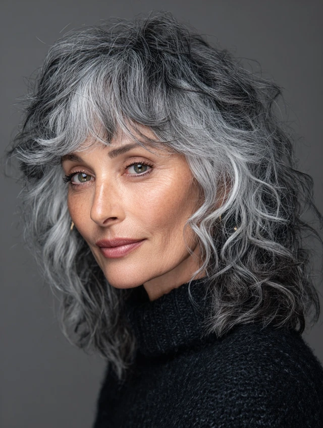 Instead of covering gray, this style embraces it. A shag cut with layers enhances natural salt and pepper tones. It works well for thicker hair types.