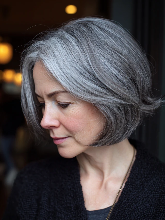 A chin-length bob trims away older color while keeping structure. Soft layers prevent the look from feeling heavy or blocky. This style suits round and oval faces.