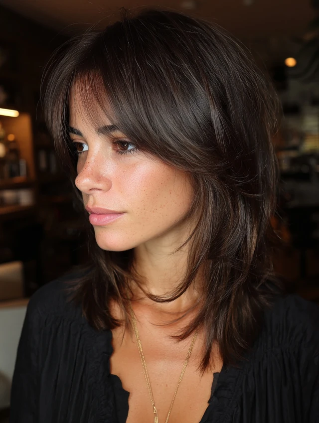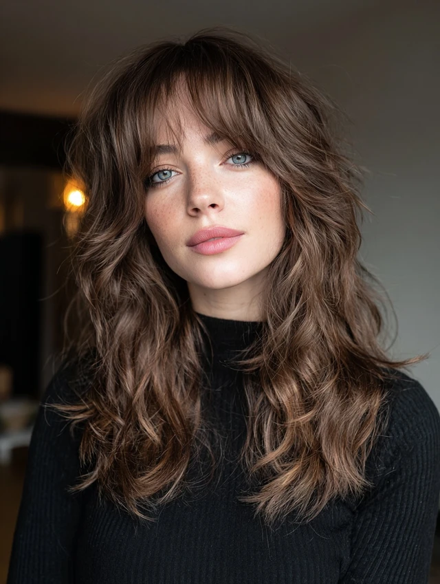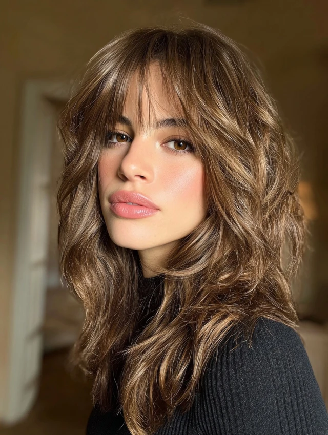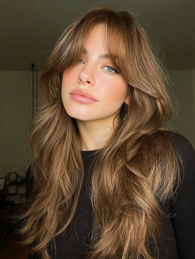 Curtain bangs soften the forehead without heavy coverage. They open slightly at the center and blend into layers. This style flatters round and heart-shaped faces.