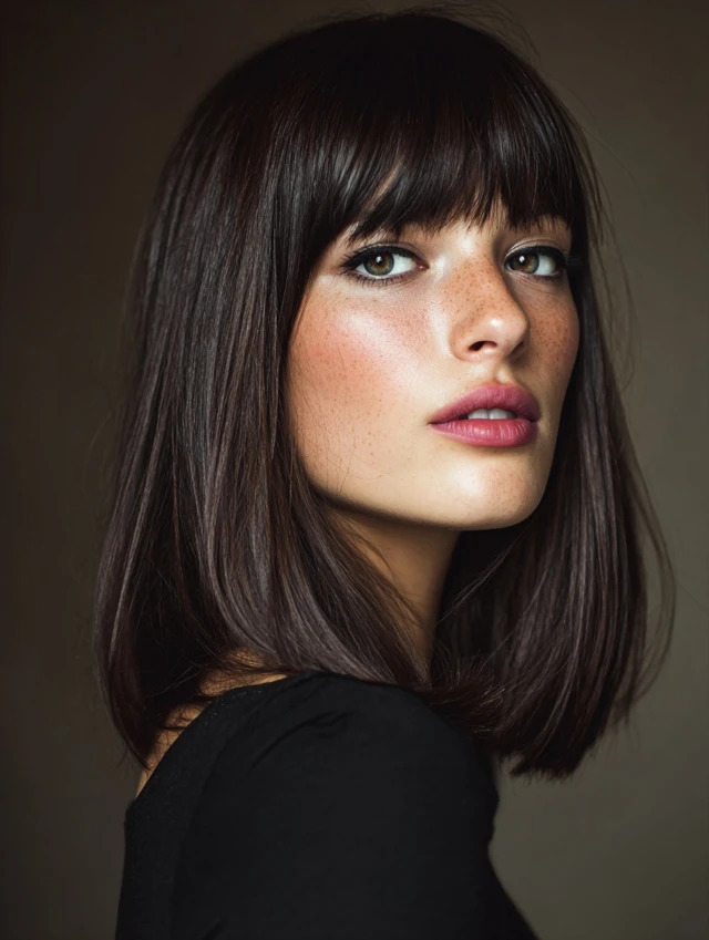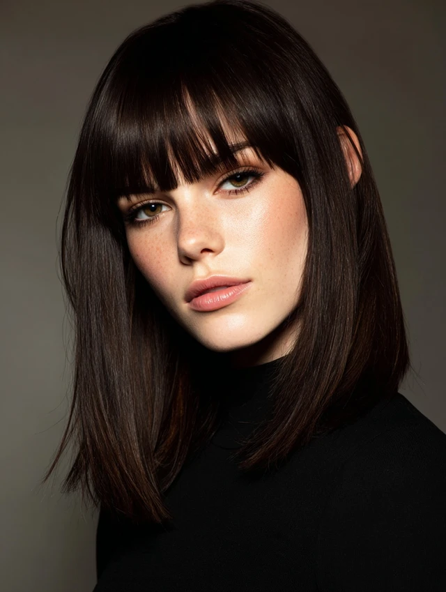 Blow-dry bangs flat with a round brush. Keep the rest sleek or softly layered. This style fits professional and structured settings. Regular trims keep the fringe sharp.