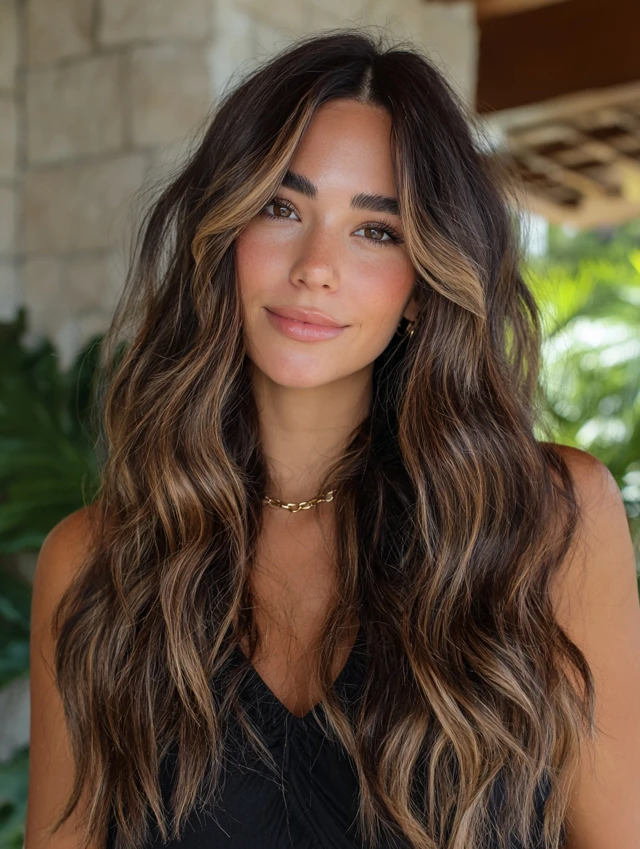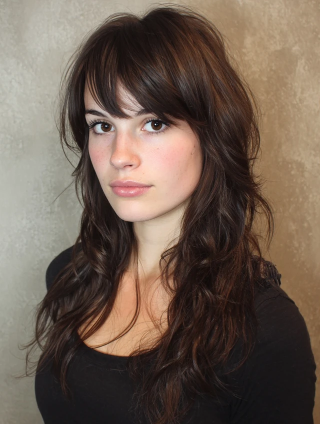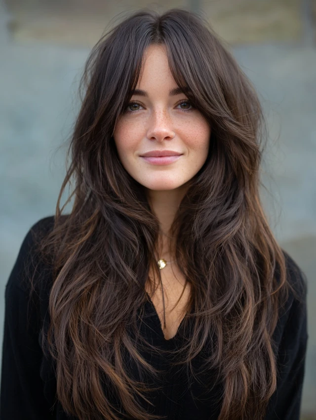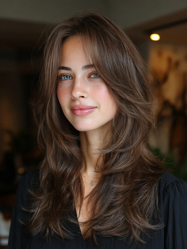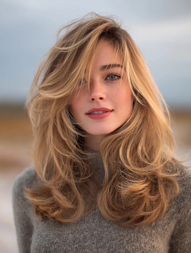 Long layers with soft face framing pieces shift attention downward. This balances forehead height. The layers highlight cheekbones and jawlines. This style suits most face shapes.