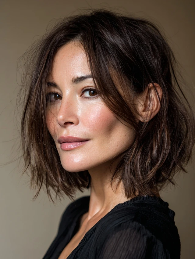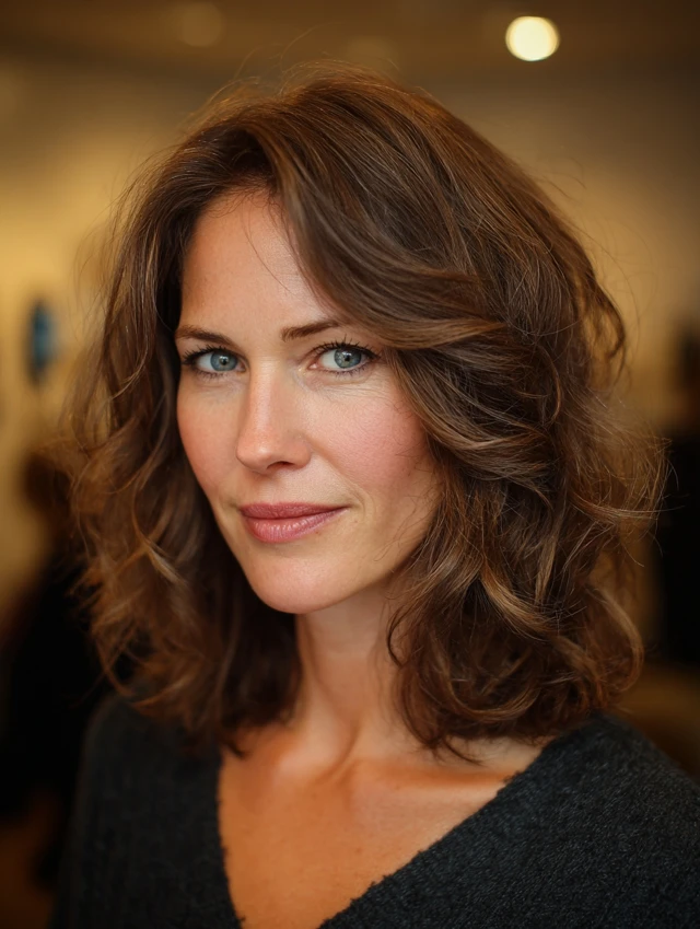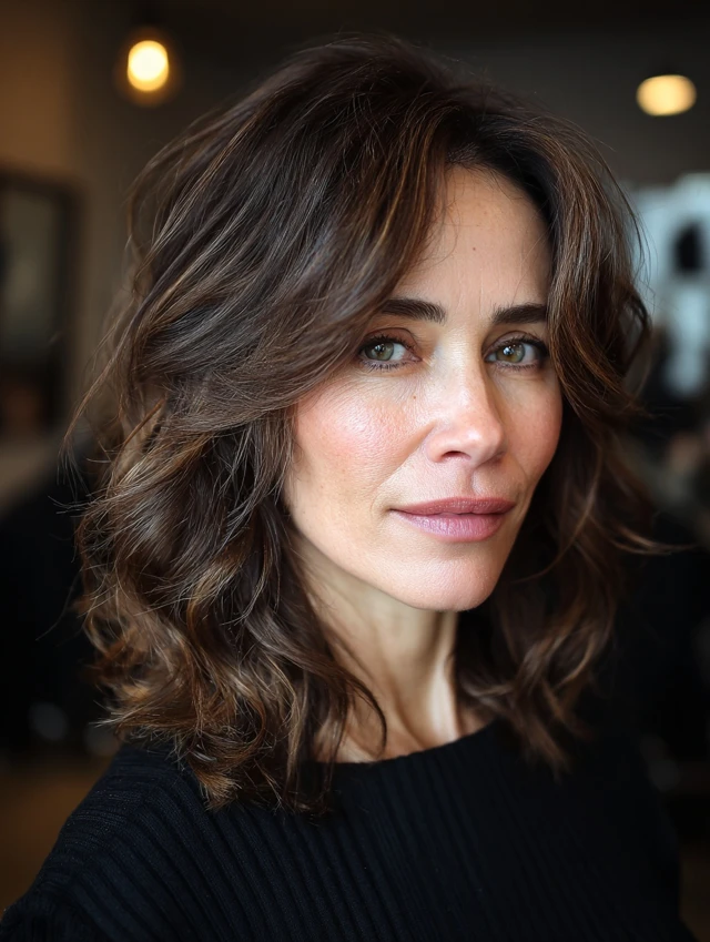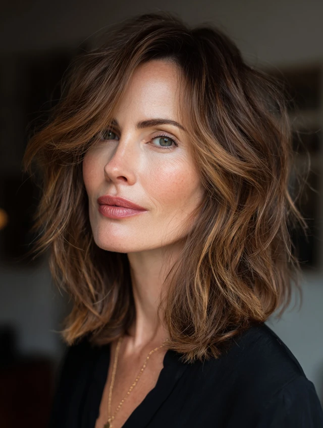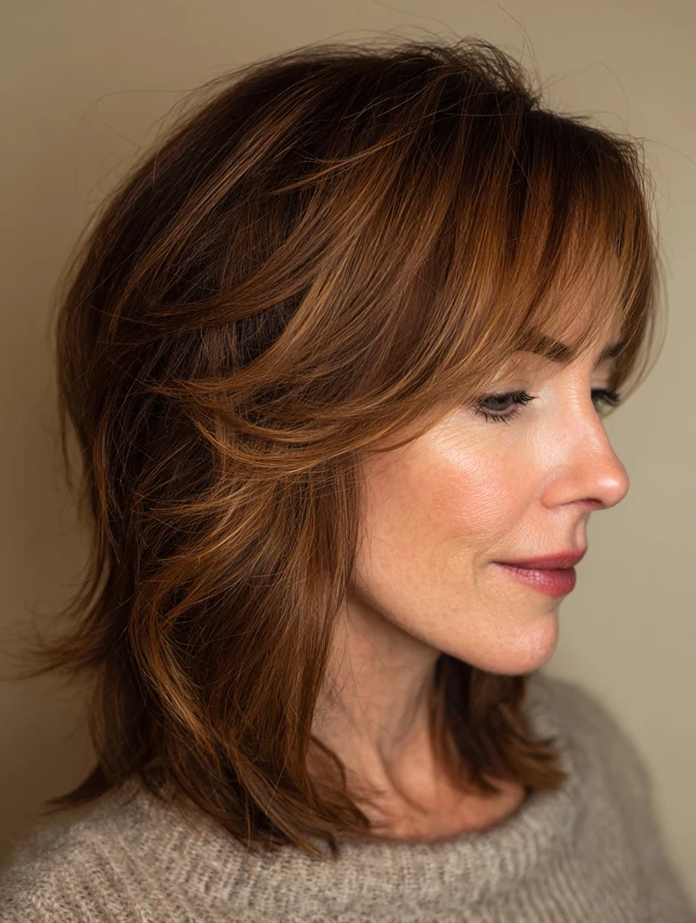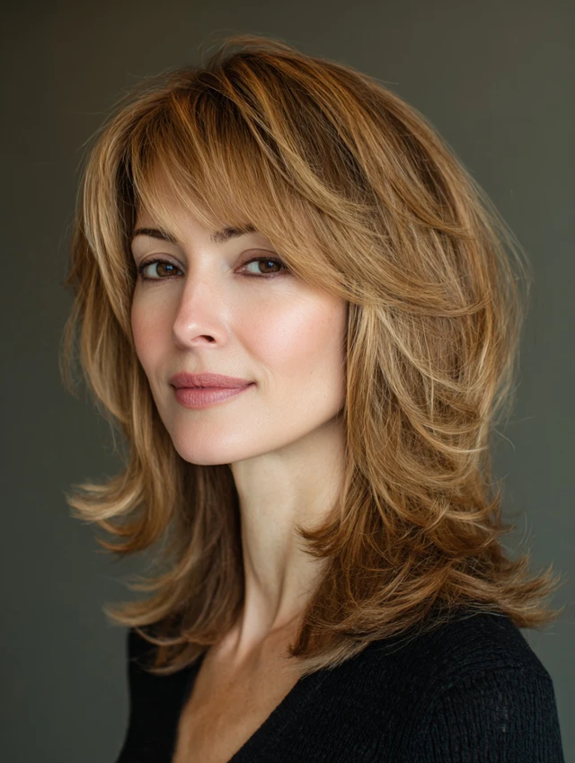 Side-swept bangs create a diagonal across the forehead. That breaks up strong horizontal lines. Medium layers keep the look soft and balanced. Fine to medium hair adapts easily to this style.