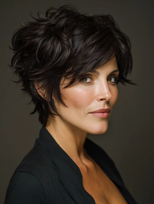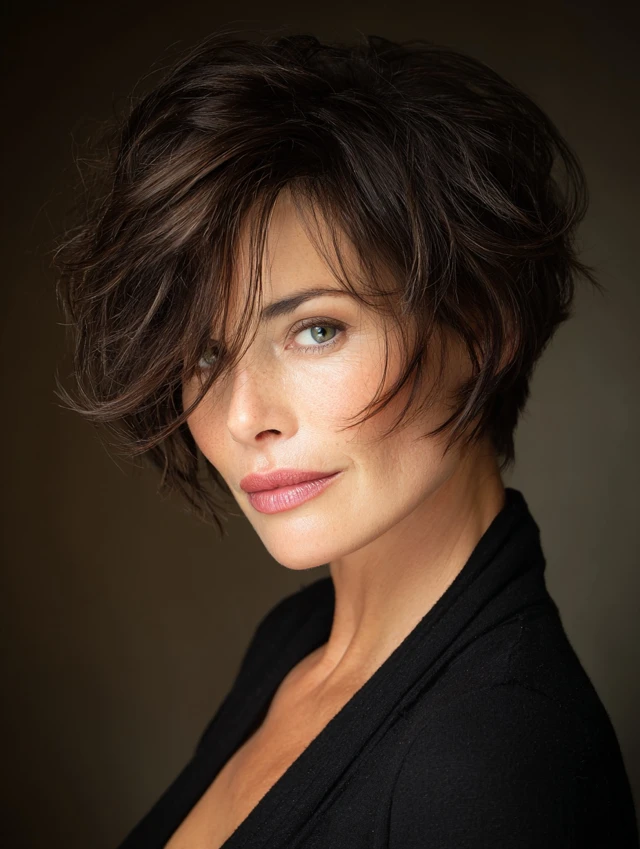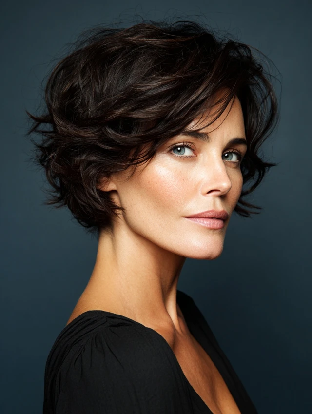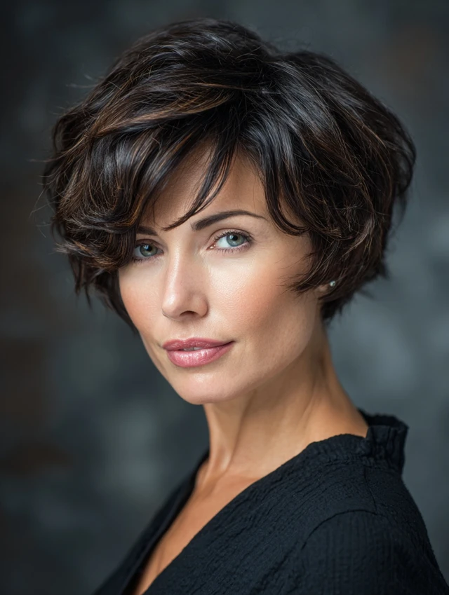 A short layered cut with lift at the crown elongates the face. Keeping the sides softer prevents a boxy look. This style suits fine and medium hair textures.