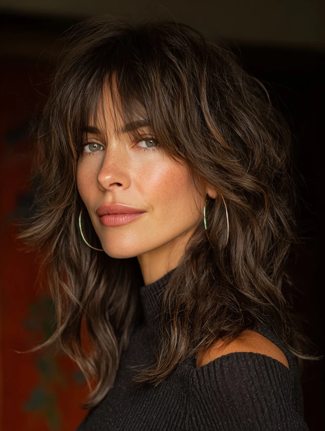 A textured shag builds height at the crown. Curtain bangs frame the face gently without harsh edges. This style works well for thicker hair types and adds youthful movement.