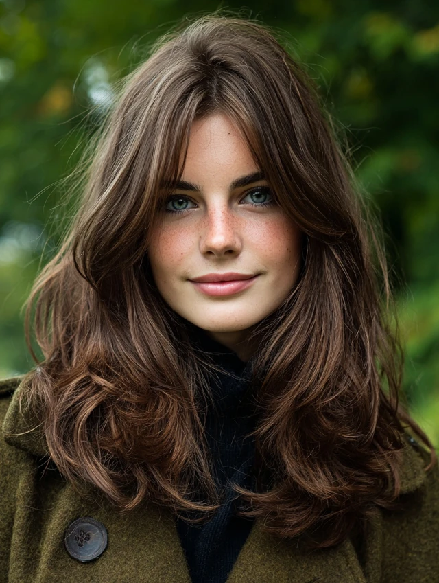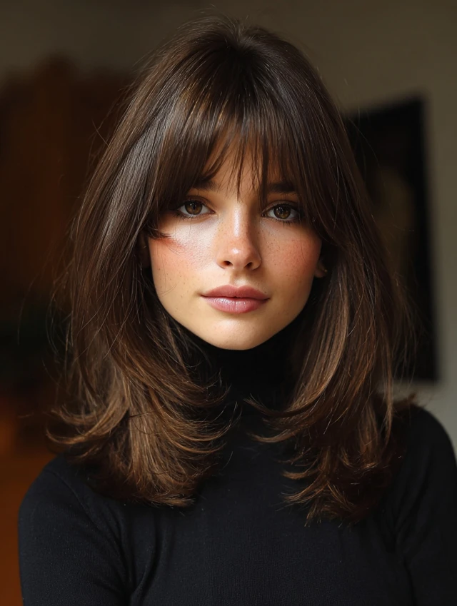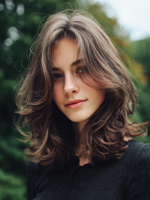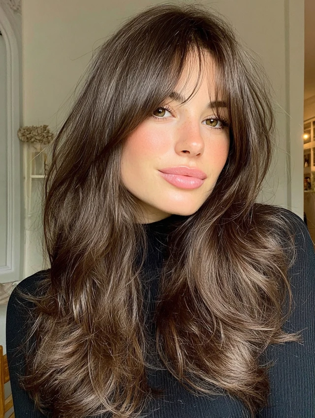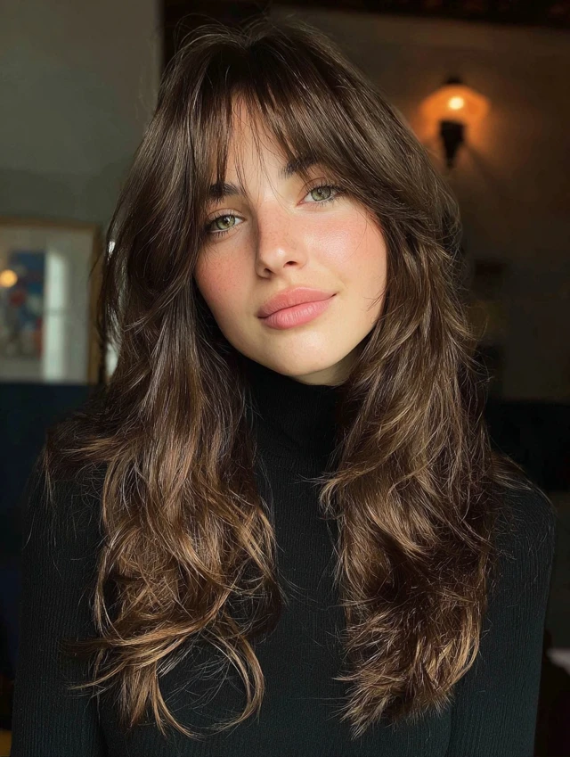 Curtain bangs soften the forehead while keeping the center slightly open. This works well for round and heart-shaped faces. The layers blend naturally and prevent the look from feeling heavy.