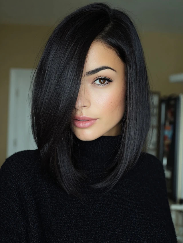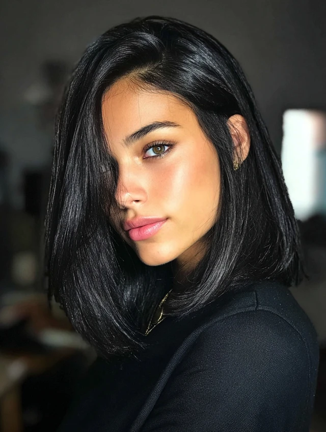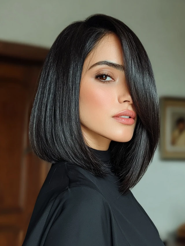 A long bob paired with a deep side part shifts attention sideways. This reduces vertical emphasis. It flatters round and square faces by creating structure. Medium to thick hair supports this style well.