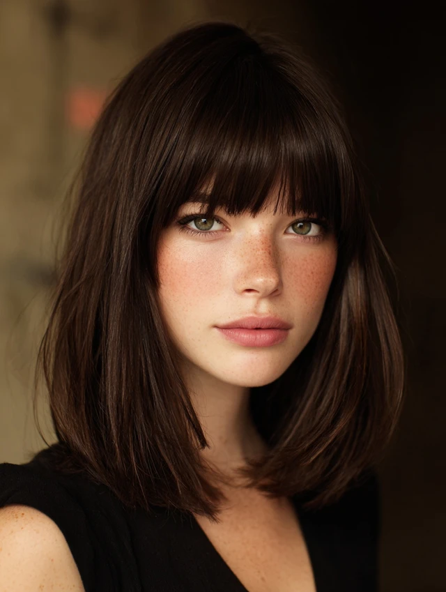 Blow-dry bangs flat with a round brush. Keep the rest sleek or softly layered. This style suits professional and structured settings. Trim bangs often to maintain the sharp line.