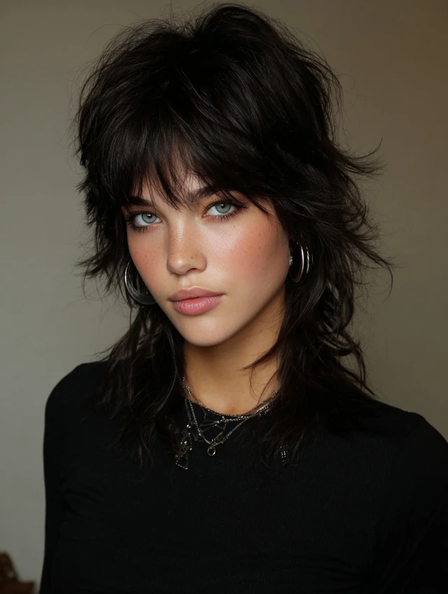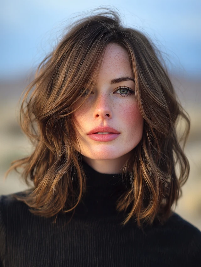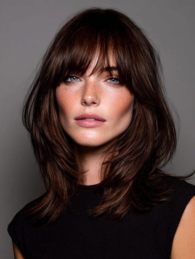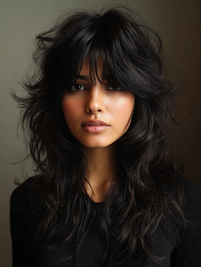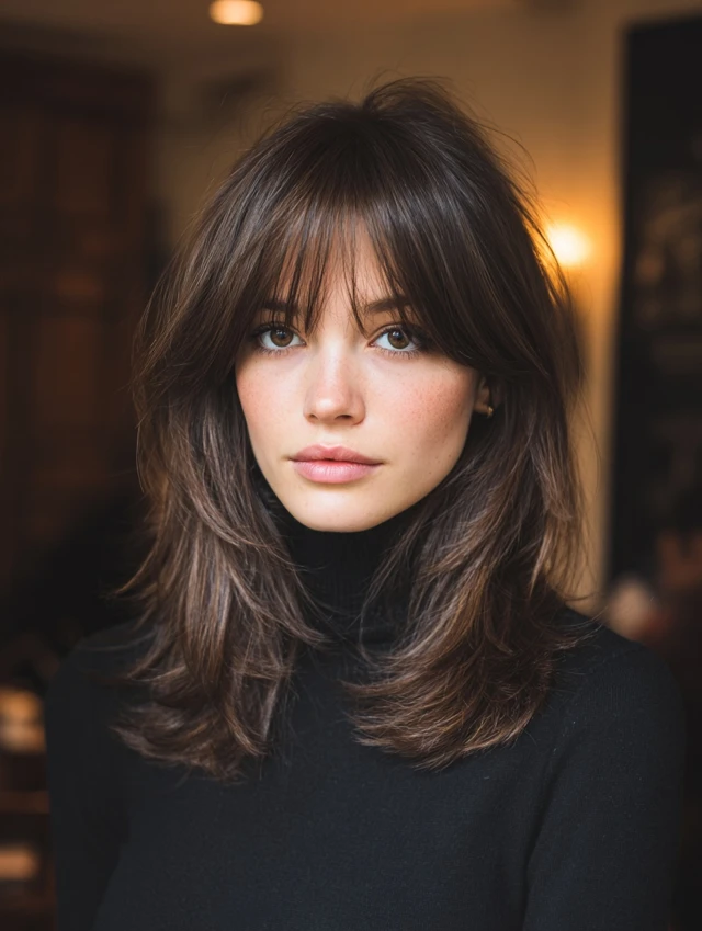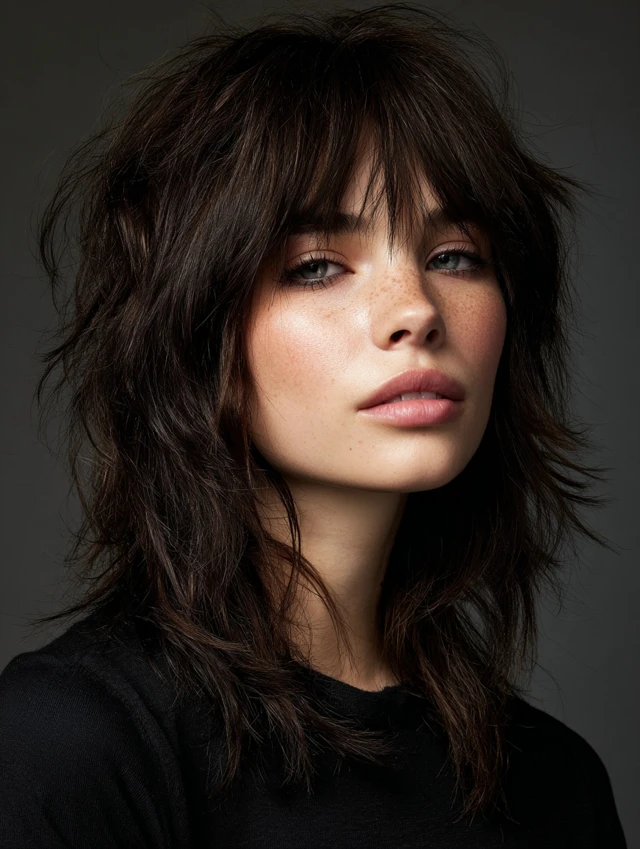 A layered shag builds volume around the cheeks instead of the crown. The fringe softens the forehead area without a heavy block. This works well for thicker hair types.