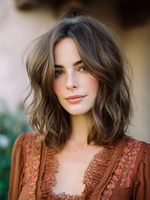 Soft waves add width at the sides of the face. That balances a larger forehead. Face framing layers bring attention to the cheekbones and jawline. This style suits most face shapes.