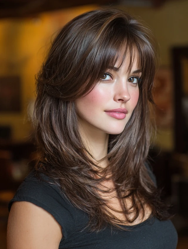 Blow-dry the bangs away from the face for movement. Add loose waves for dimension. This style fits everyday wear and formal events. It grows out gracefully.