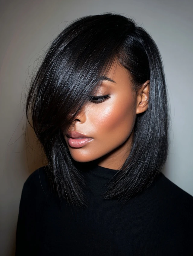 Blow-dry bangs to one side for structure. Keep the rest lightly textured. This cut transitions easily from day to night. Regular trims keep the angle sharp.