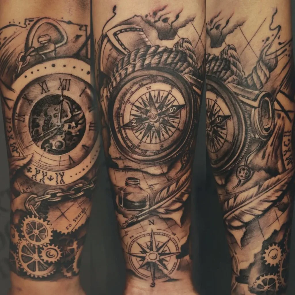 The gears connect the elements and guide the eye across the arm. Soft shading helps the map background blend with the heavier lines. The mix of navigation symbols, machinery, and old-world details works well for anyone who wants a piece that reflects direction, movement, and personal journey.