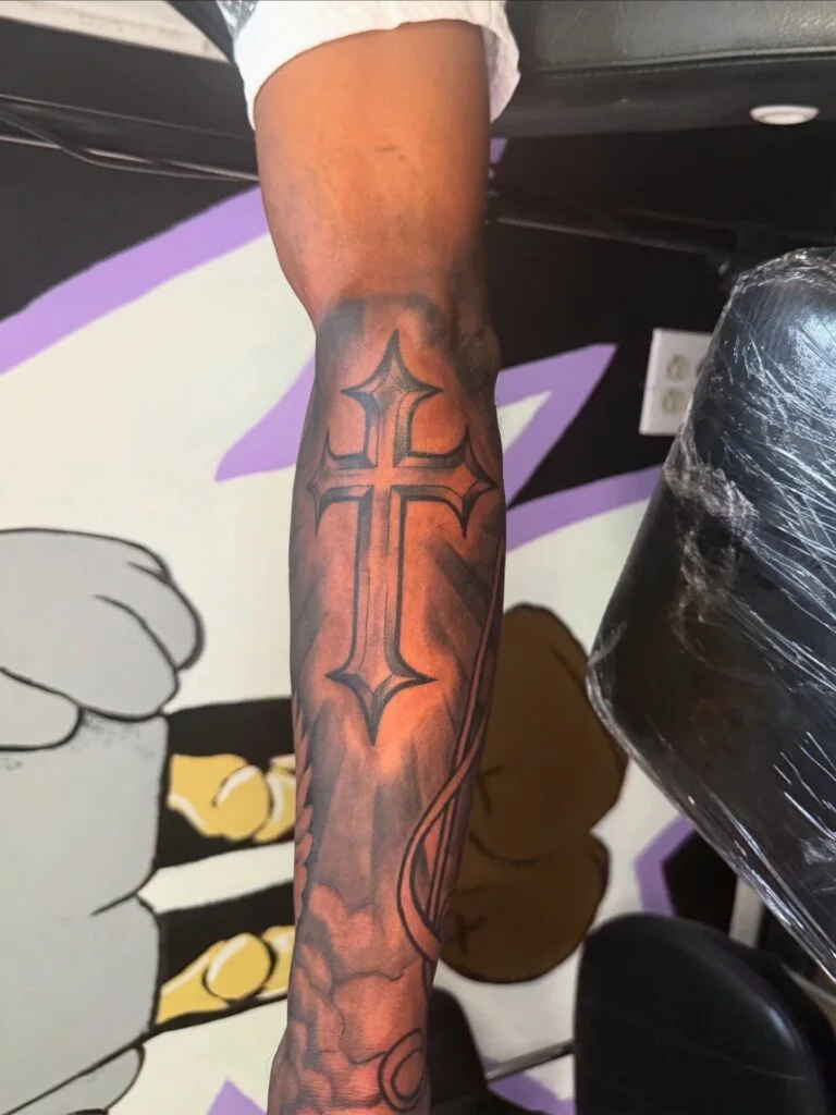 Subtle background gradients add depth and guide the eye down the arm. The flowing lines beneath the cross connect the upper and lower sections, creating smooth movement. This tattoo works well for anyone who wants a simple, focused piece that highlights faith with strong and clear structure.
