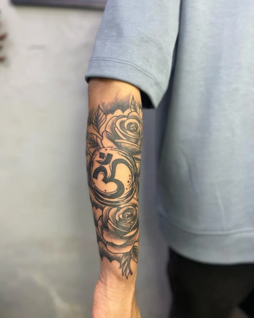 This half sleeve tattoo features a bold Om symbol placed between two large shaded roses. The rounded shape of the symbol contrasts with the layered petals, creating a clear focal point on the forearm. Soft background shading helps the roses stand out, and the leaves add structure around the central design.