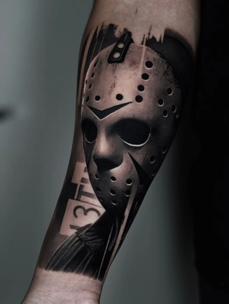 Vertical streaks above the mask add movement and make the piece feel more dramatic. The “13th” detail ties directly into the theme and strengthens the overall concept. This tattoo works well for anyone who wants a bold horror-inspired design that delivers clear focus and strong visual impact without unnecessary clutter.