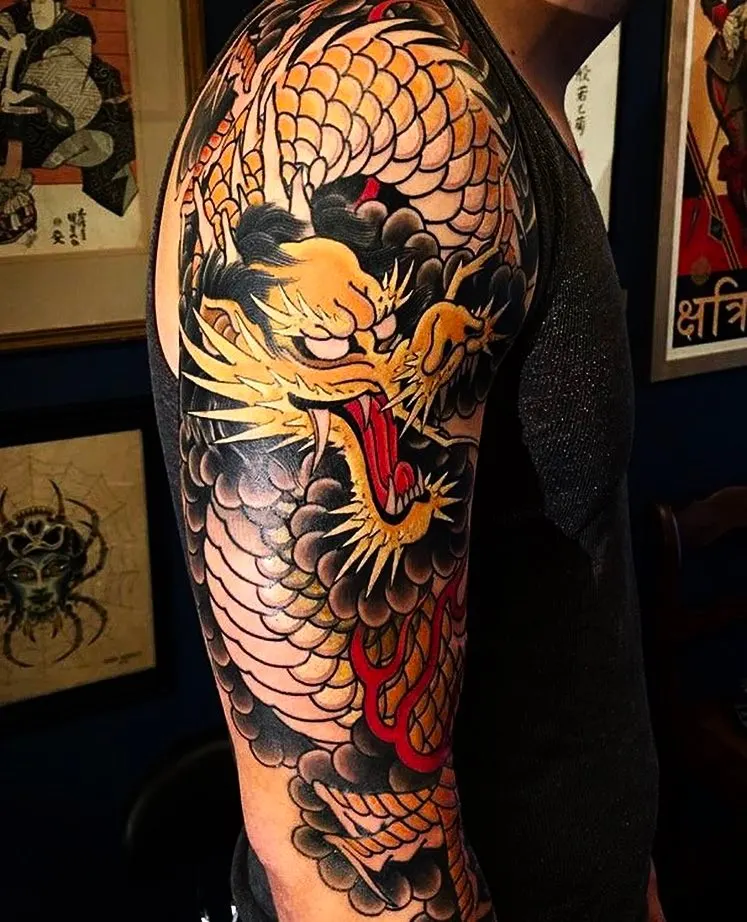 This half sleeve tattoo shows a bold Japanese dragon wrapping around the upper arm with intense movement and clear detail. The dragon’s open mouth, sharp teeth, and bright red tongue create strong focus, while the golden scales add contrast.