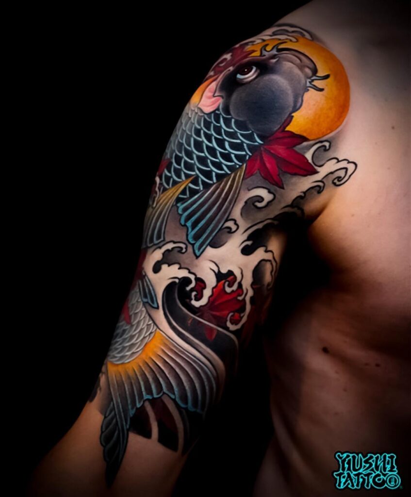Red maple leaves frame the koi and add balance around the circular sun behind its head. The smooth gradients in the fins guide the eye down the arm. This design works well for anyone who wants a bold, colorful piece that blends traditional Japanese elements with clean, modern shading.