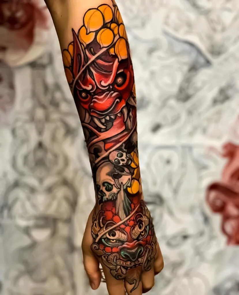 This half sleeve tattoo shows a fierce red oni mask stretching from the forearm to the hand, creating a strong vertical flow. The upper mask features wide eyes, sharp teeth, and bold shadows that push the expression forward. Yellow elements frame the top and add contrast against the deep reds.