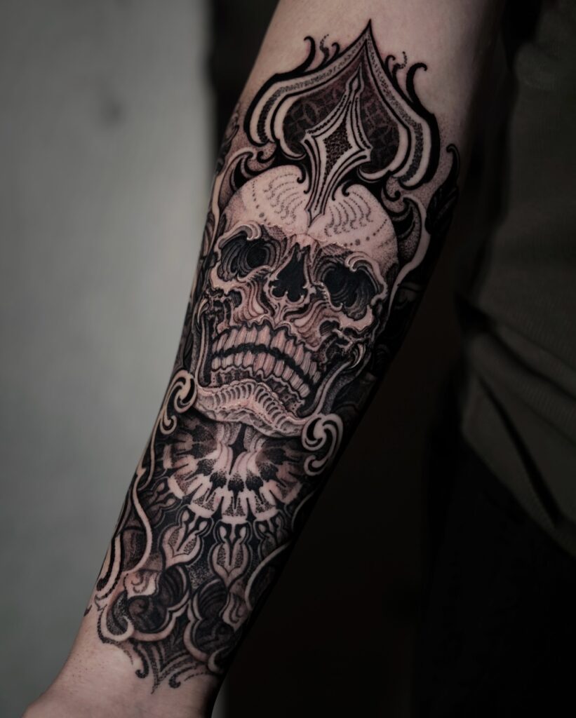 This half sleeve tattoo shows a detailed skull framed by bold ornamental shapes that stretch along the forearm. The skull features deep shadows that add weight, while the carved patterns around it create a layered, almost architectural feel.