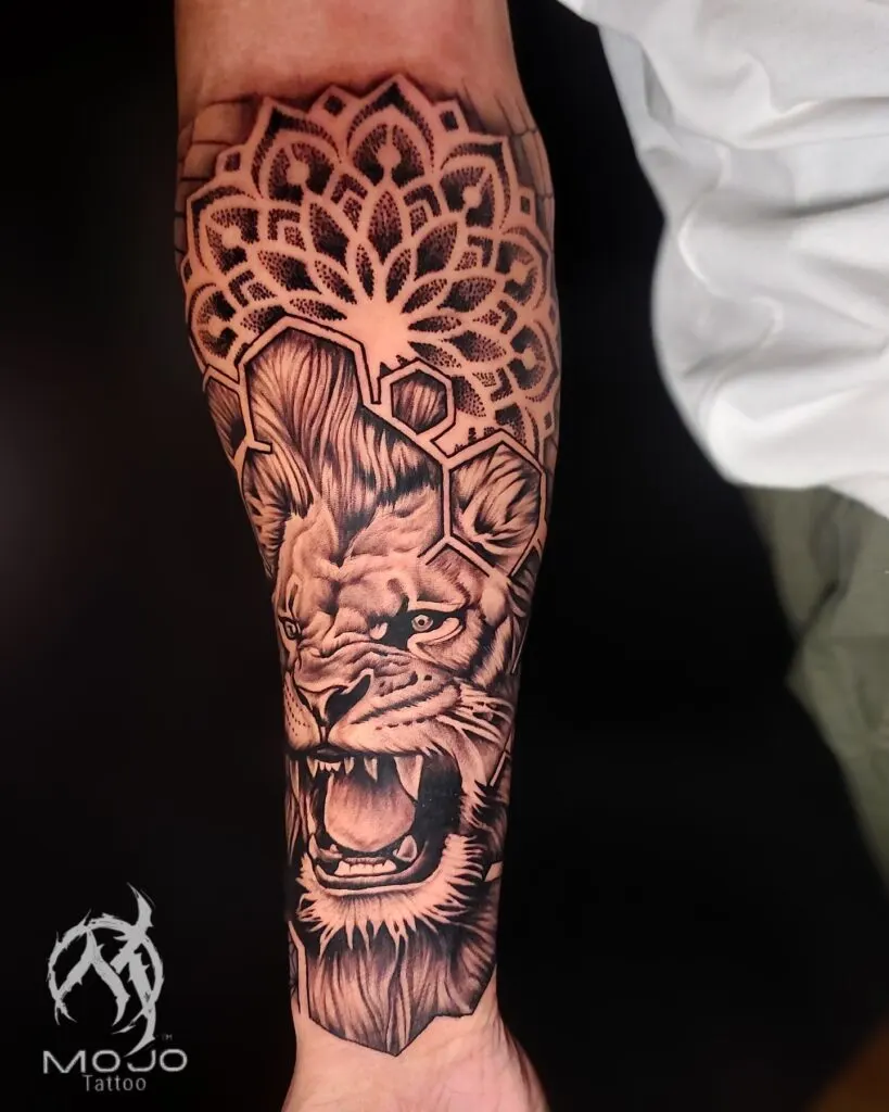 This half sleeve tattoo features a roaring lion framed by bold geometric outlines and a detailed mandala above the head. The lion’s expression creates strong intensity, and the shading brings depth to its fur and open mouth.