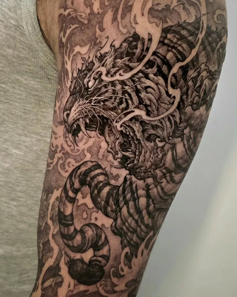 Dark clouds frame the creature and push the brighter colors forward. The flowing body curves naturally around the shoulder and arm, giving the design clear direction. This tattoo works well for anyone who wants a powerful piece that expresses strength, motion, and traditional Japanese style.