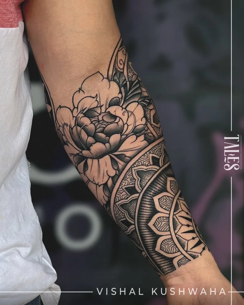 This half sleeve tattoo combines a bold mandala with a large blooming flower, creating a structured yet expressive design. The mandala uses sharp lines and layered shapes that wrap cleanly around the forearm.