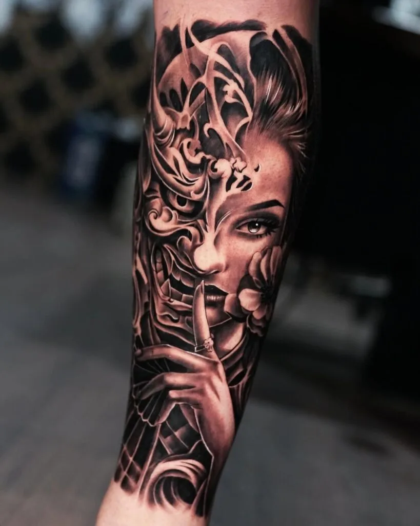 This half sleeve tattoo shows a woman holding a finger to her lips while wearing a detailed mask that covers half her face. The design uses strong shading to create depth, and the contrast between the exposed features and the mask adds tension.