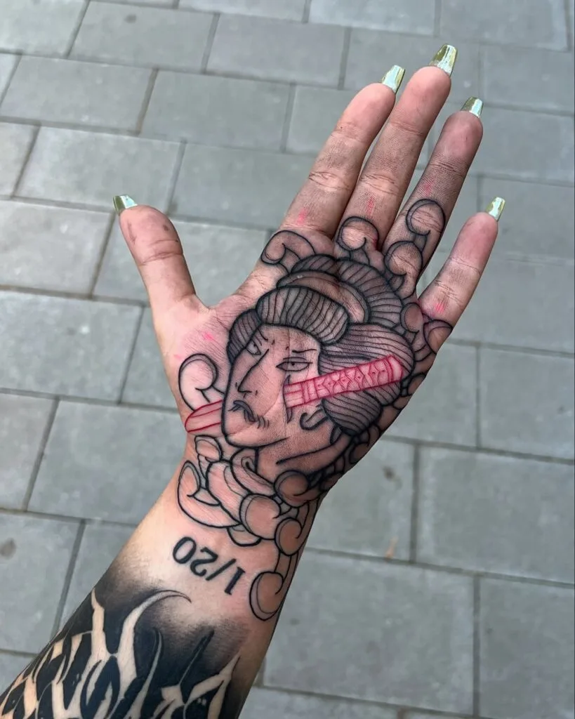 This bold hand tattoo features a stylized samurai face framed by flowing clouds. Thick black outlines and fine line shading highlight the warrior’s stern expression and traditional topknot hairstyle. A katana stretches across the face with bright red accents, symbolizing strength and honor.