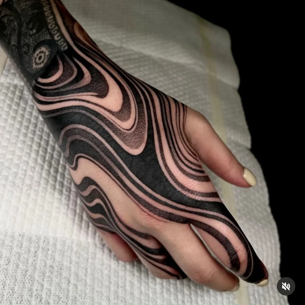 This mesmerizing hand tattoo features smooth, flowing black lines that curve gracefully across the skin like waves or wood grain. Thick, bold bands of black contrast beautifully against negative space, creating an organic, hypnotic pattern that stretches from the wrist to the fingers.
