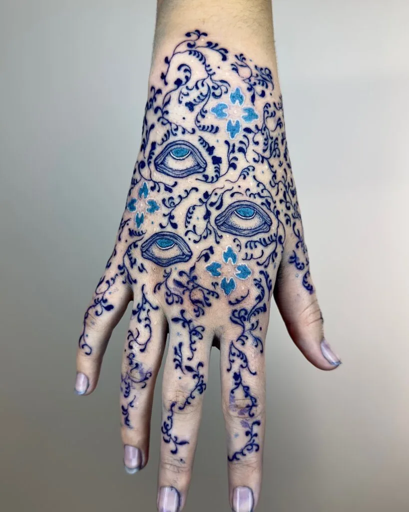 This unique hand tattoo features delicate ornamental designs intertwined with surreal blue eyes scattered across the skin. The intricate swirling patterns add a graceful, lace-like flow, creating contrast against the mysterious, all-seeing eyes.